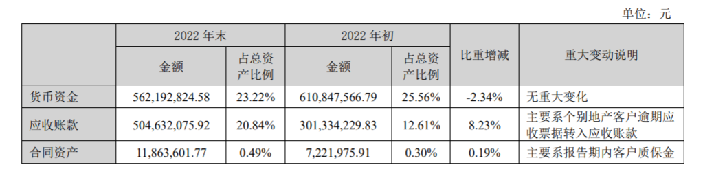 分产品来看,定制橱柜及其配套产品、定制衣柜及其配套产品毛利率均有不同程度的下滑,分别下滑30.23%、4.41%。应收账款方面,由2022年初3.01亿元增加至2022年末5.05亿元,期末应收账款占总资产比例20.84%。