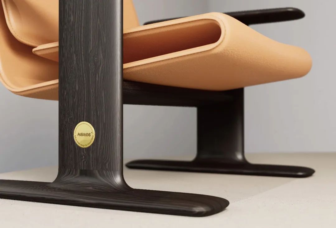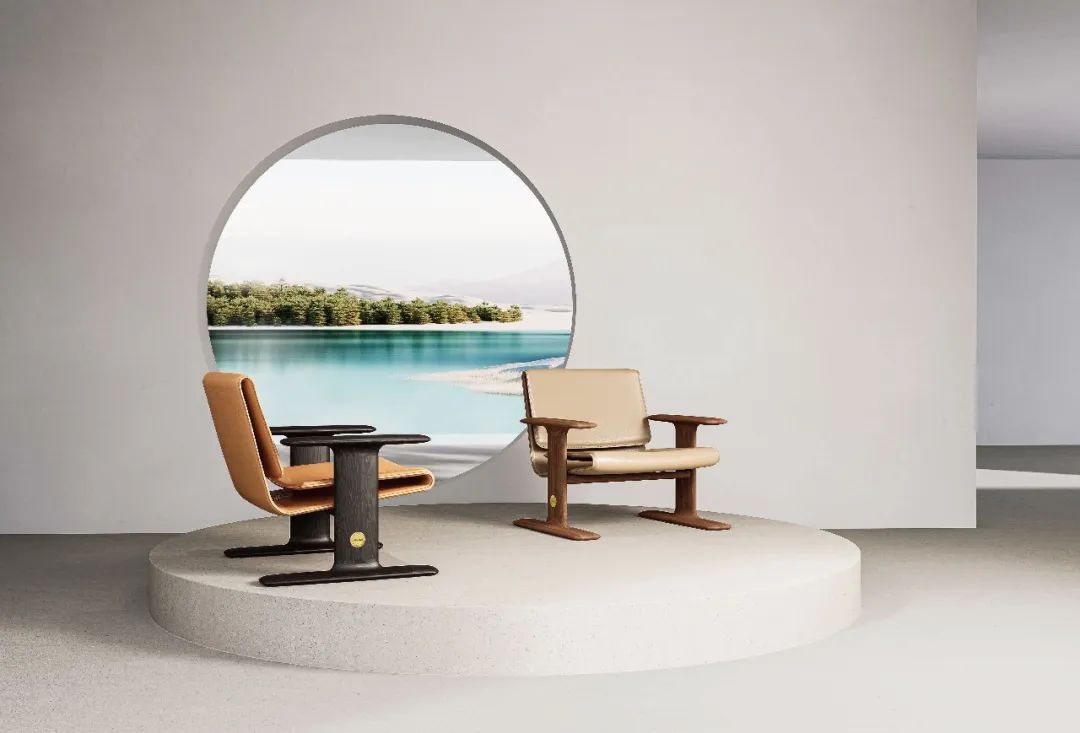 椅子的实木框架融合自然界弧形的造型元素,有机曲线的设计语言,让木框更具纤薄、轻盈,与坐面形成一种如同建筑般的平衡感。扶手椅的座面及靠背采用悬空的设计,人坐上去之后有一定的弹性。座面包覆马鞍皮,让座面的视觉看起来非常薄。金属件嵌入木框,可以在金属件上镭射出品牌logo,带给用户更多的品牌信息及细节感受。