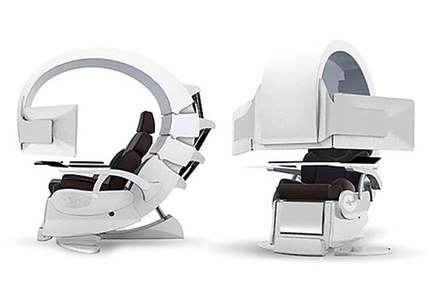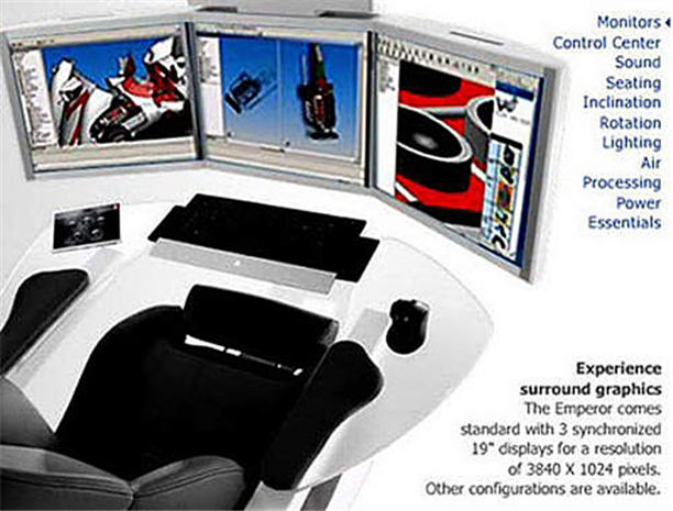 在各类科幻片和动漫中,宇宙战舰的战舰驾驶员都会有一张狂霸酷拽屌的不行的驾驶座,现在已经有了让你们实现终极幻想的机会——Emperor200 智能工作游戏站,现在只要45000美元哦亲!仿生学设计的座椅,模拟动物脊髓的造型,不仅方便用户自由调整自由调整屏幕的高度,同时背后的座椅也会自动调整角度以给你最舒适的坐姿,这对于长期玩游戏和工作的人来说是一个很人性化的设计。