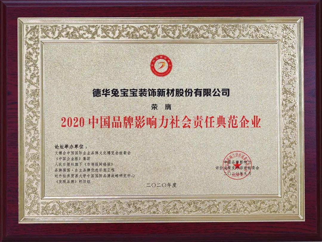 品牌影响力是企业开拓市场、赢得市场并获得利润的能力,正日渐成为左右用户选择消费的重要因素。兔宝宝自创立以来,一路践行着“厚德敬业”的核心价值观,以实际行动履行社会责任,加强了社会各界对兔宝宝品牌的认知,使兔宝宝逐渐成为行业内社会责任典范品牌。抗疫期间,兔宝宝积极承担社会责任,在得知西安“小汤山”医院、湖北十堰竹溪分院改建等项目物资需求信息后,公司积极支持当地经销商做出快速响应,组织货源,完成物资和车辆的紧急调配,争分夺秒连夜将物资装车、交付、卸货,助力于医院建设快速投入使用。除此之外,公司向德清县红十字会捐赠500万元人民币,用于防疫物资的采购等。这充分展现了一个企业的责任与担当,获得该奖项可谓是实至名归。