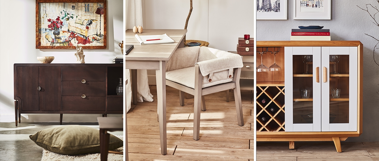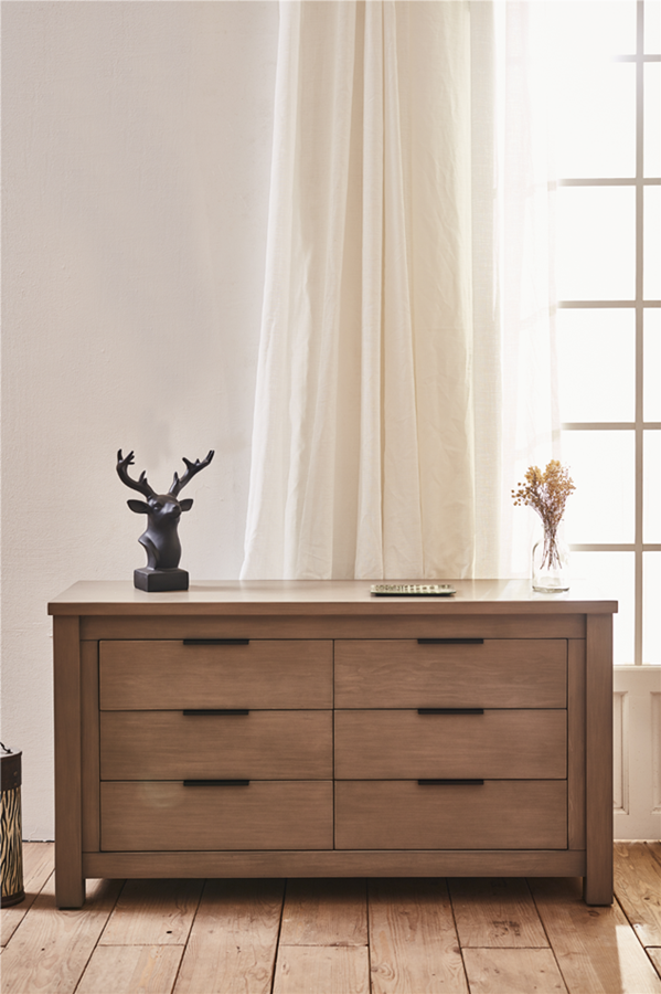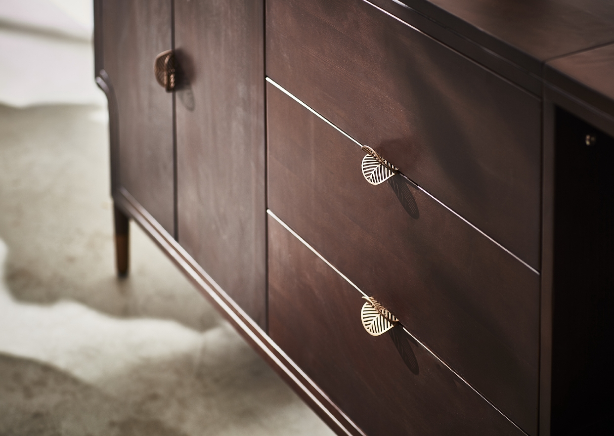 同样是色泽浓郁的款式,铁杉制成的家具摒弃了繁复的雕花,采用更为圆润、简洁的线条,再加上金属把手做点缀,一扫红木的「古旧」沉闷感。