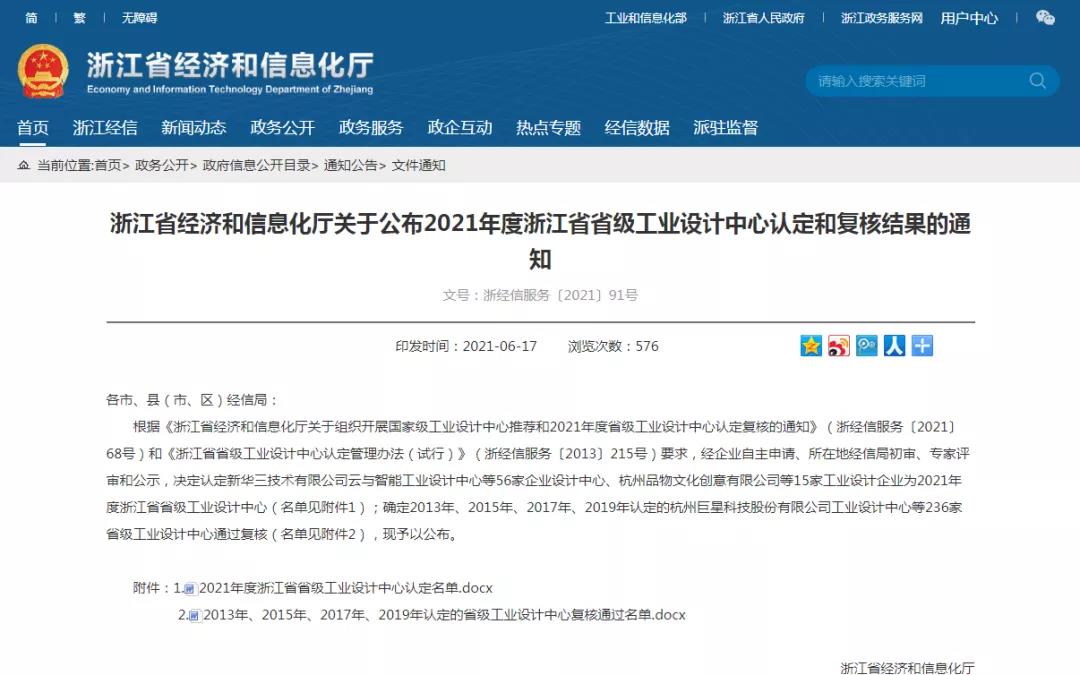 2021年6月17日,浙江省经济和信息化厅官网公布了《2021年度浙江省省级工业设计中心认定和复核结果的通知》,经企业申请、所在地经信局初审、专家评审和公示等流程,省经信厅决定56家企业设计中心、15家工业设计企业为2021年度浙江省省级工业设计中心;确定236家省级工业设计中心通过复核。