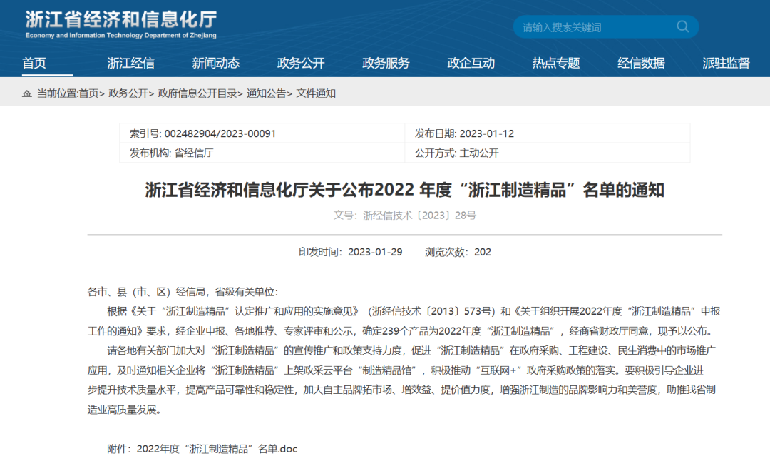 该榜单根据《关于“浙江制造精品”认定推广和应用的实施意见》(浙经信技术〔2013〕573号)和《关于组织开展2022年度“浙江制造精品”申报工作的通知》要求,经企业申报、各地推荐、专家评审和公示后评出。