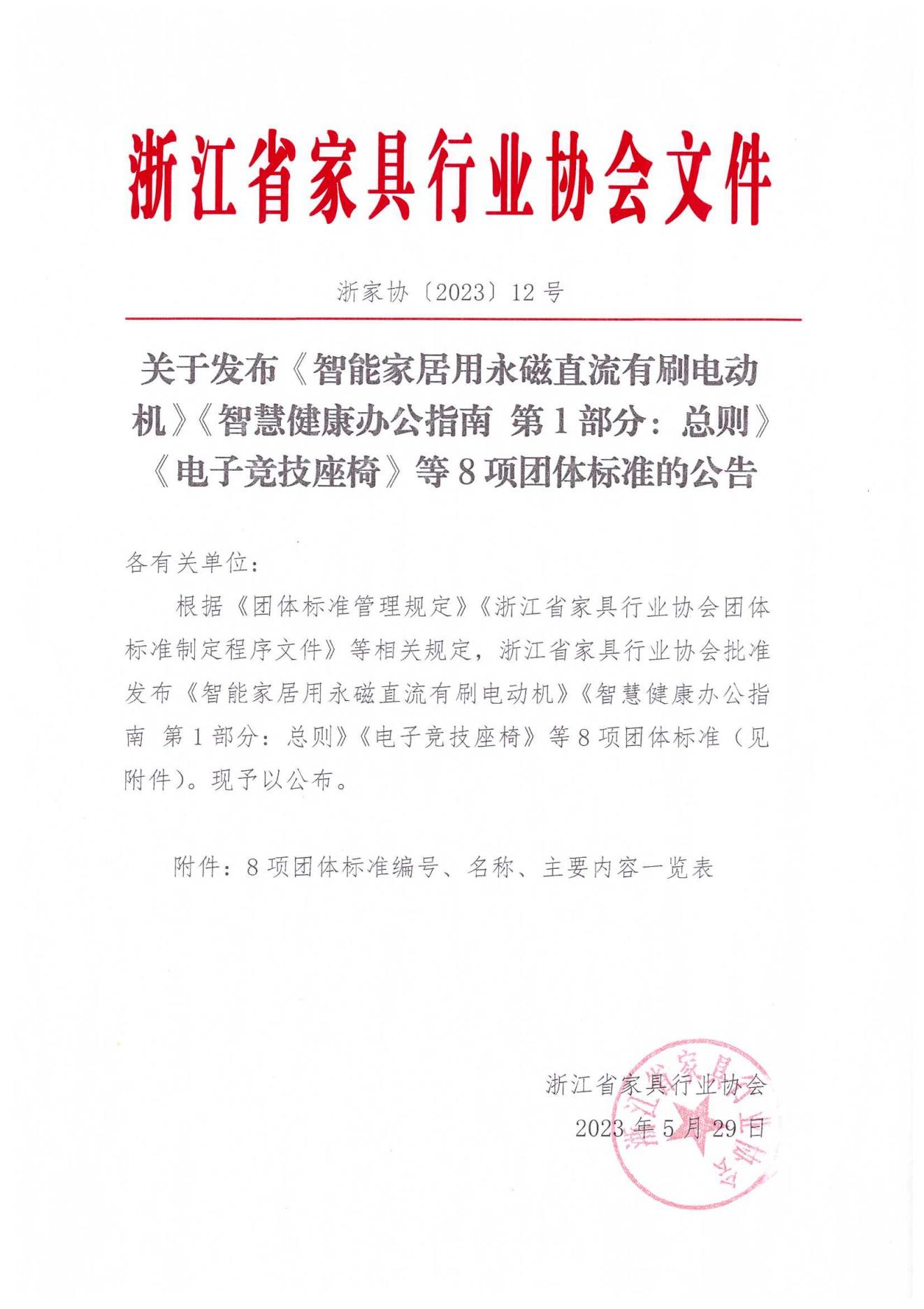 关于发布《智能家居用永磁直流有刷电动机》《智慧健康办公指南 第1部分:总则》《电子竞技座椅》等8项新利luck18官网客服的公告