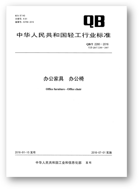 QB/T 2280-2016《办公家具 办公椅》标准由工业和信息化部发布并于2016年7月1日实施,标准规定了产品的定义、分类、要求、试验方法、标志、包装等,对办公椅作了系统的、全面的规定,尤其是要求部分,详细规定了尺寸、形状和位置公差、外观、理化性能、力学性能、阻燃性、甲醛释放量、TVOC和安全性,是所有标准中项目最齐全的,为办公椅产品质量的评估提供了明确的依据,为企业的生产制造提供了有力的技术支持,同时也为质量监管部门提供了标准上的支撑。标准的实施有效地促进了办公椅行业的健康发展。