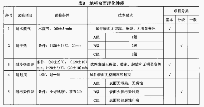 在理化性能方面,地柜主要对耐水蒸气、耐干热、耐冷热温差、耐划痕、耐污染性能、耐酸碱性能、抗冲击性能、浸渍剥离性共8个指标项进行了规定。