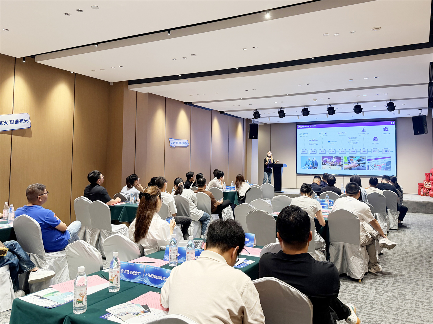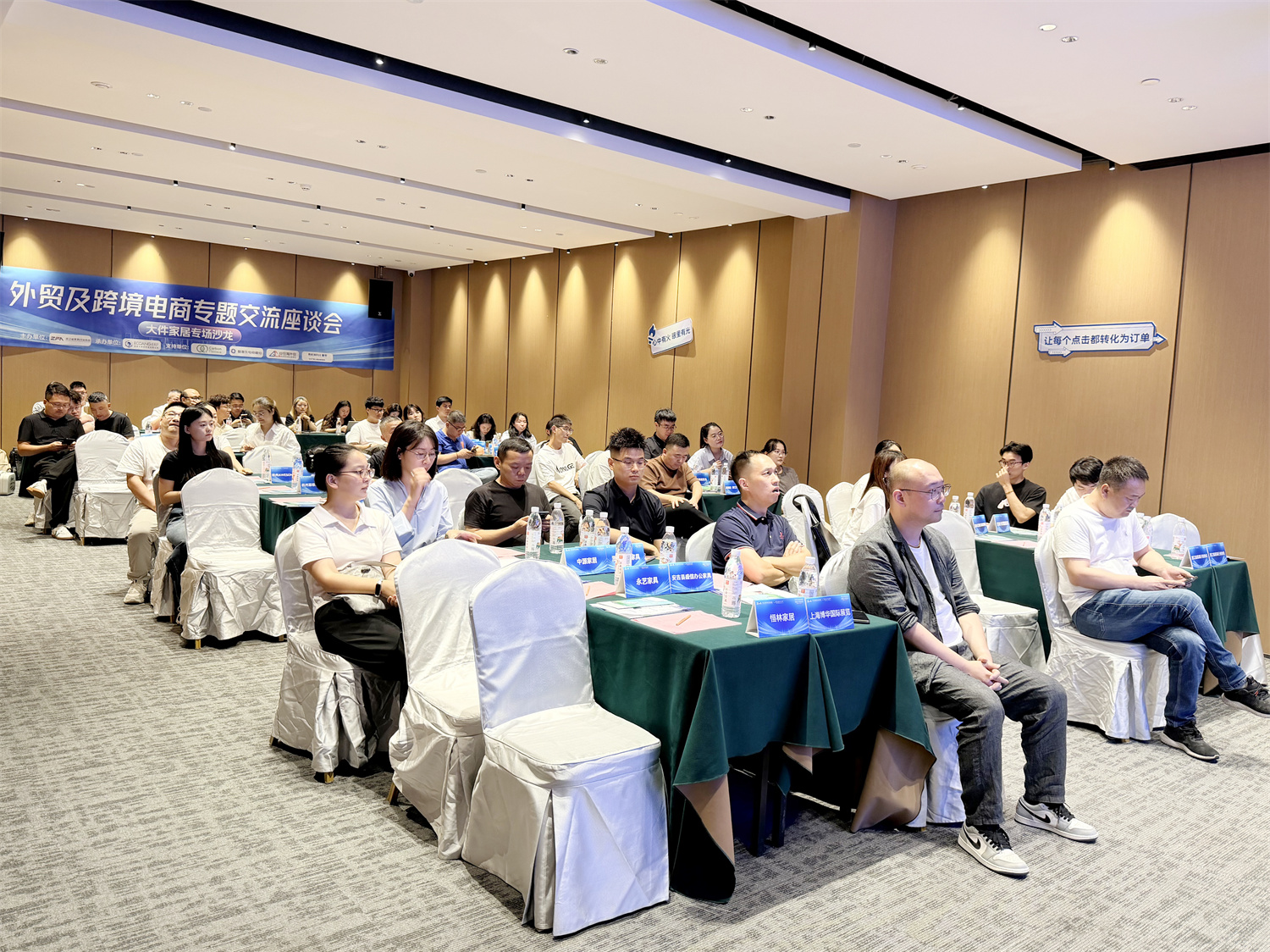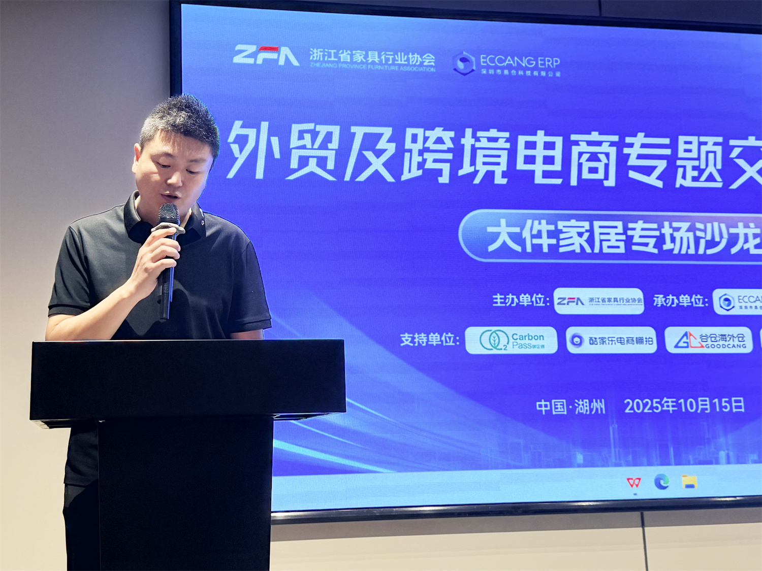 wayfair 招商经理 柯冰分析了在线家居消费趋势;深圳市易仓科技有限公司大客户经理 杨安义讲解了跨境电商仓储布局与成本控制方案;Coupang官方招商经理 何瑛介绍了韩国家居消费趋势与入驻实操;瑞丰德永杭州公司总经理 施伊涵则解答了多市场布局下的税务优化方案等实务问题,美客多招商经理 武轩宇分享了拉美市场机遇;谷仓浙江区业务负责人 黄锐分享了安吉家具产业带本土海外仓解决方案;杭州群核信息技术有限公司华东区营销总监 杨帆展示了家具行业数字化设计与营销新思路;碳企通公司华东总监 陈超强讲解了家具出口环保合规与碳足迹管理要点。