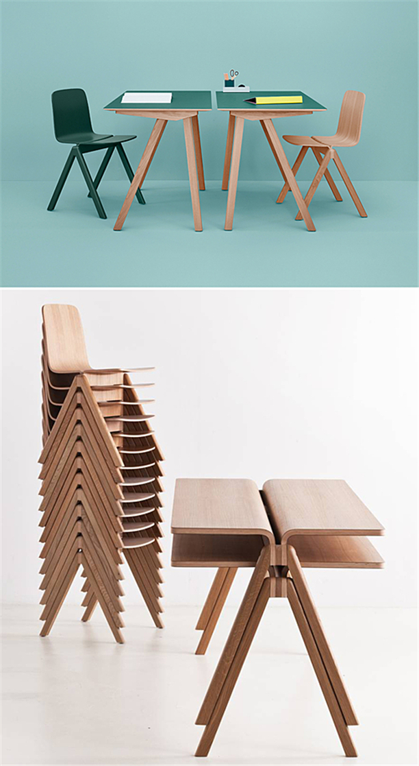 丹麦家具设计公司Hay scored Ronan和Erwan Bouroullec联合为哥本哈根大学设计了一个系列名为“Copenhague line”的学校家具,该系列家具包括木书桌、餐桌、椅子和可堆叠凳子。并根据现代需求,在工作台和办公桌的中间违者设有弯曲胶合板以提供插槽和电线通过。既能节省空间,又兼顾功能,还能再酷炫一点么?!