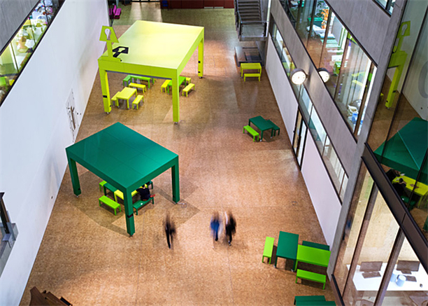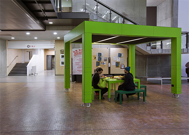 伦敦 Featherstone Young Architects 建筑事务所为它带来了一组很有意思的移动式巨型桌。最大的桌子可容纳 40 人,备有投影器材和照明装置,桌腿部分藏有电源插座、挂钩等,拉下幕帘就能成为一个小型演讲室。而 Featherstone Young Architects 也希望借此吸引学生们在这里开展交流活动,把空间利用起来。