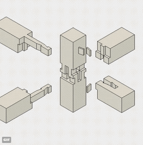 如果说榫卯结构的平面图有所让人摸不着头脑,感觉复杂的话,那名为The Joinery的推特用户就分享了一系列这种技术的动图,让我们能够直观的欣赏榫卯设计所带来的美学。