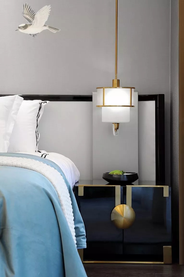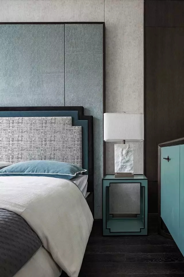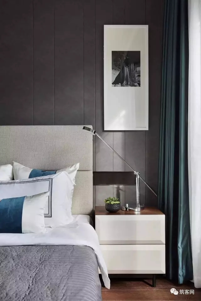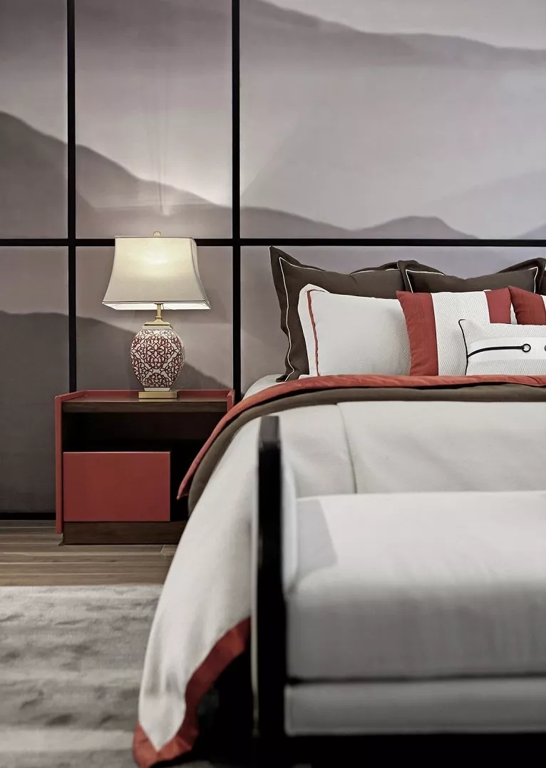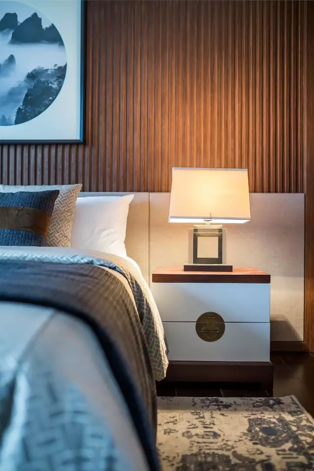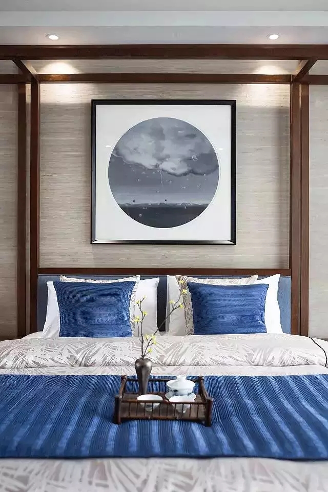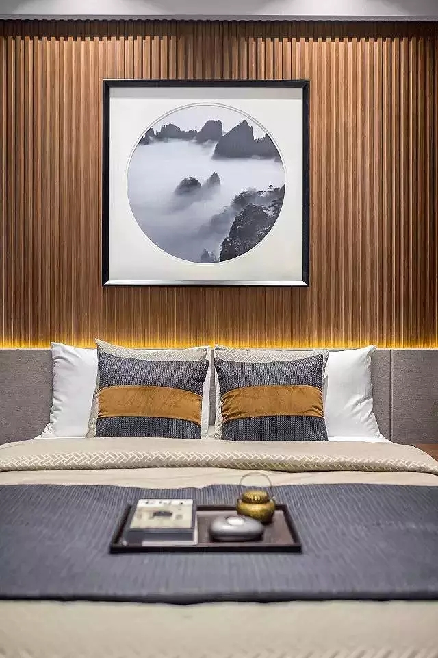 这样的直线条被运用在卧室中,一方面反映了现代人对简单生活的居住追求。另一方面,迎合了中式风格家具追求内敛、质朴的设计风格,使得新中式风格显得更加实用,更具现代感。