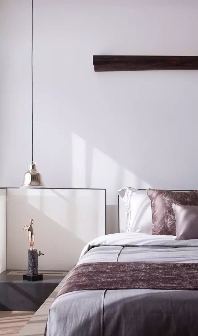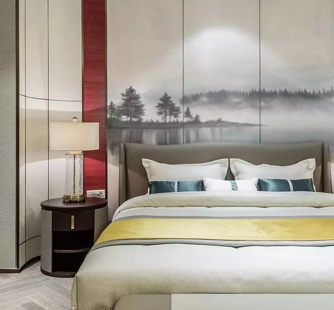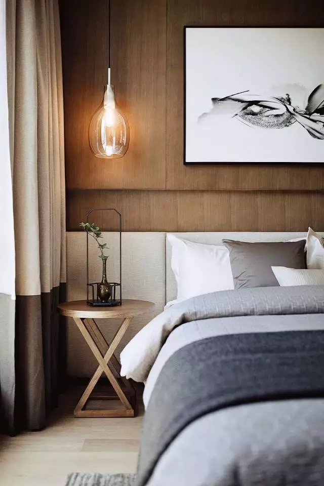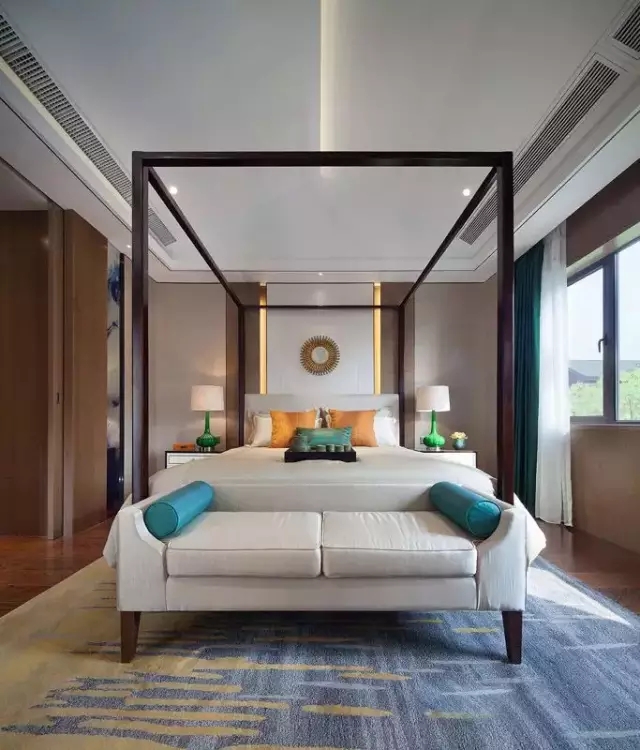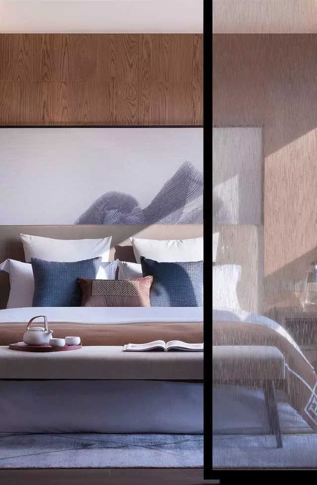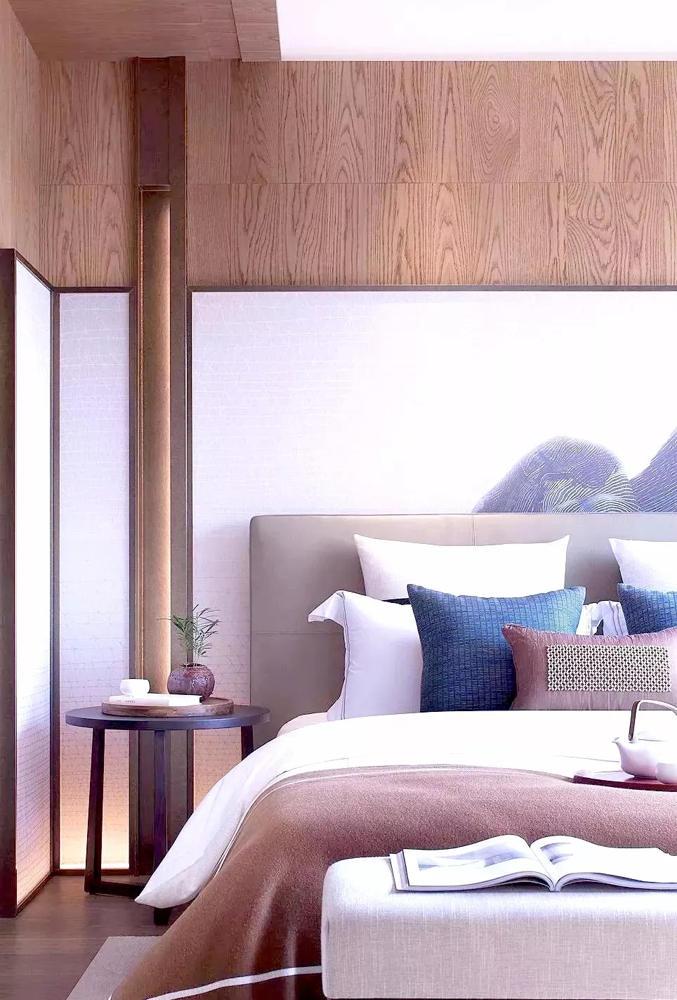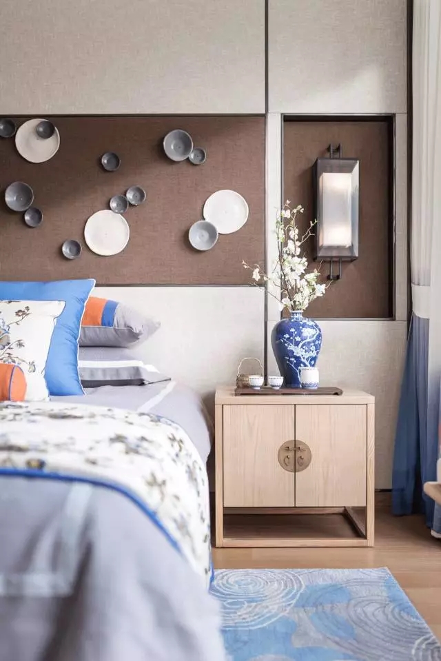 这样的直线条被运用在卧室中,一方面反映了现代人对简单生活的居住追求。另一方面,迎合了中式风格家具追求内敛、质朴的设计风格,使得新中式风格显得更加实用,更具现代感。