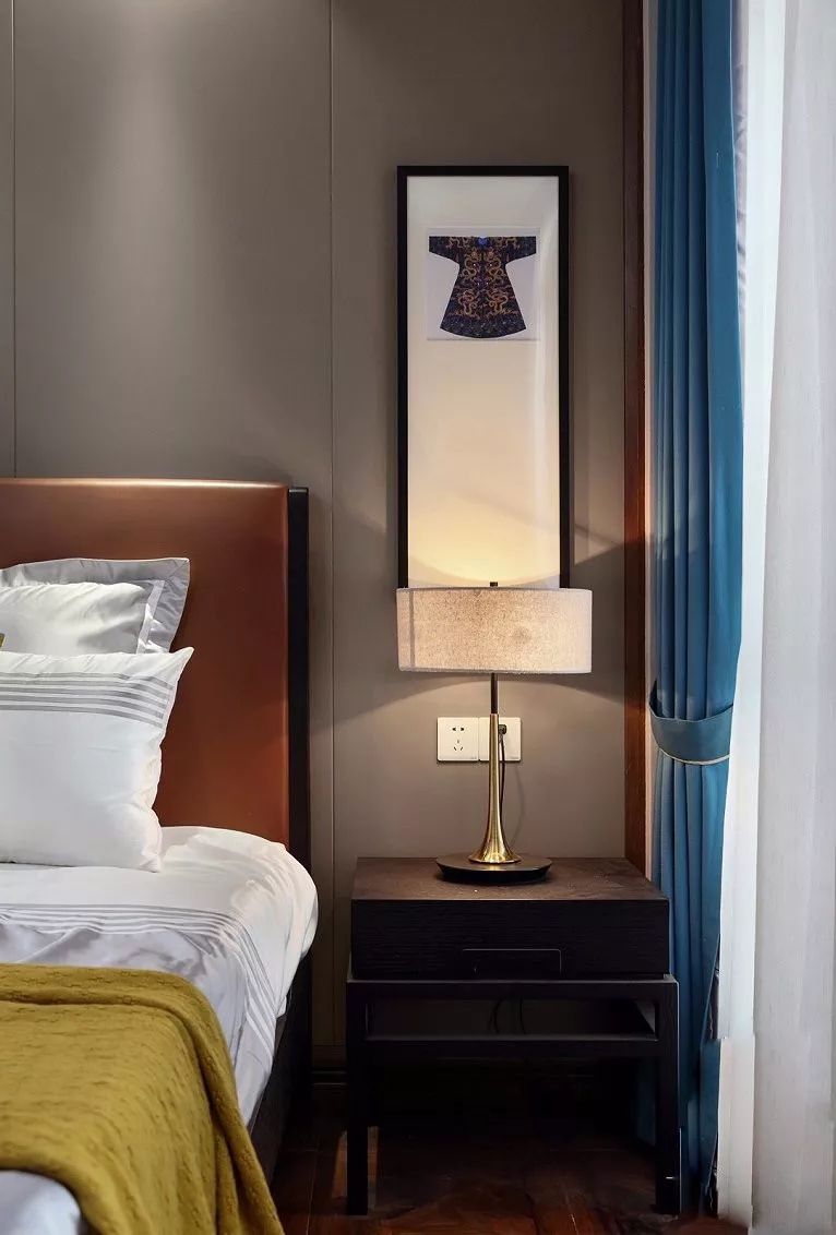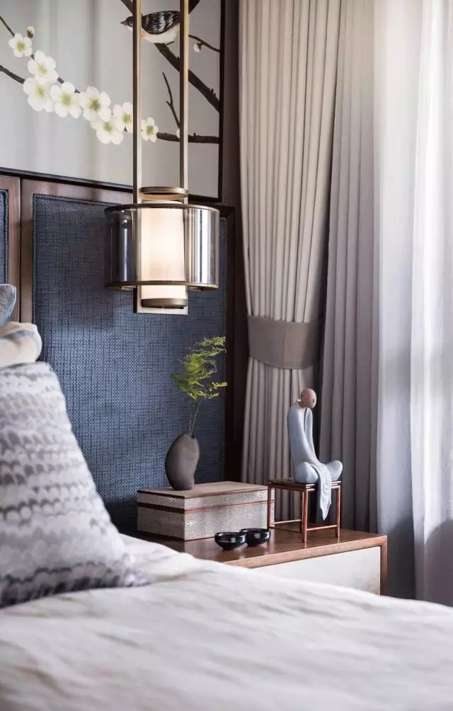 除此之外,中式风格卧室的织物应与房间主色调一致,局部服从整体。卧室窗帘可挑选柔和,垂度好且较飘逸的布料,以增强避光性和隐私性。