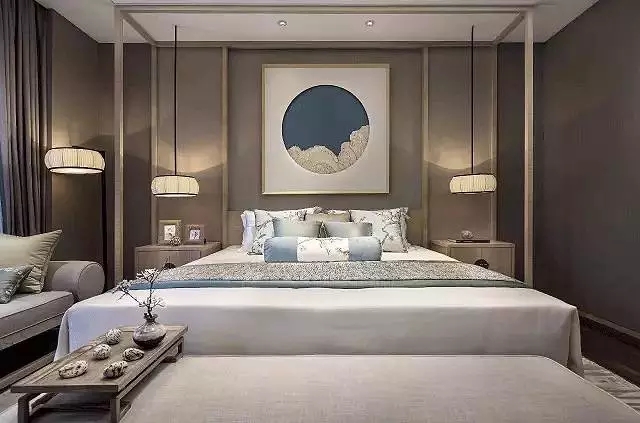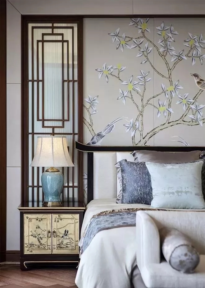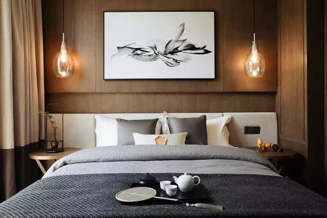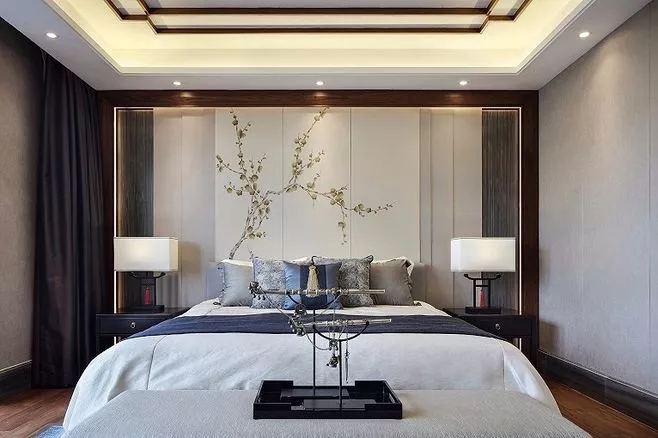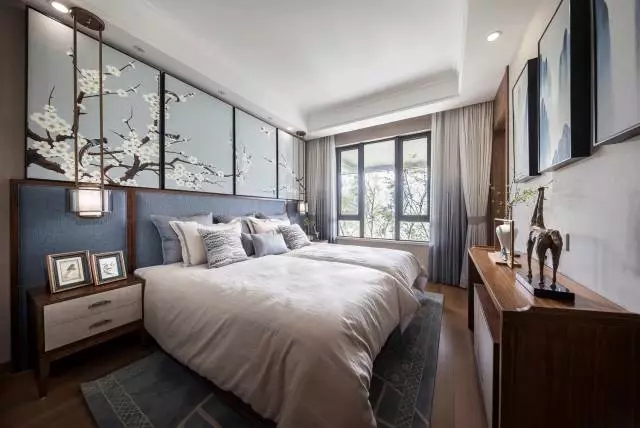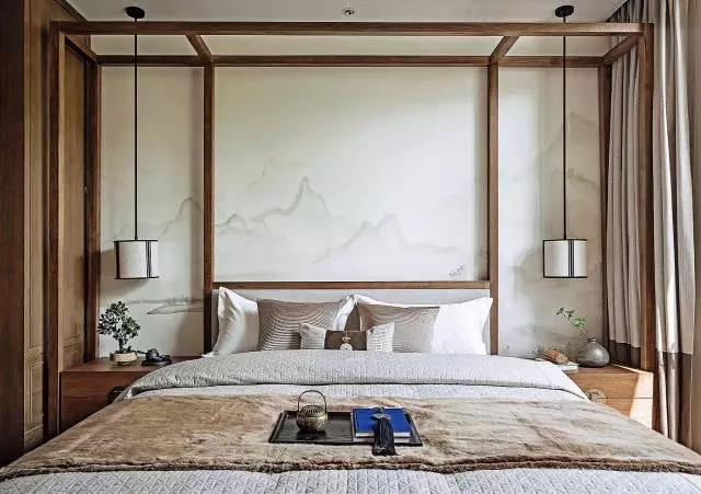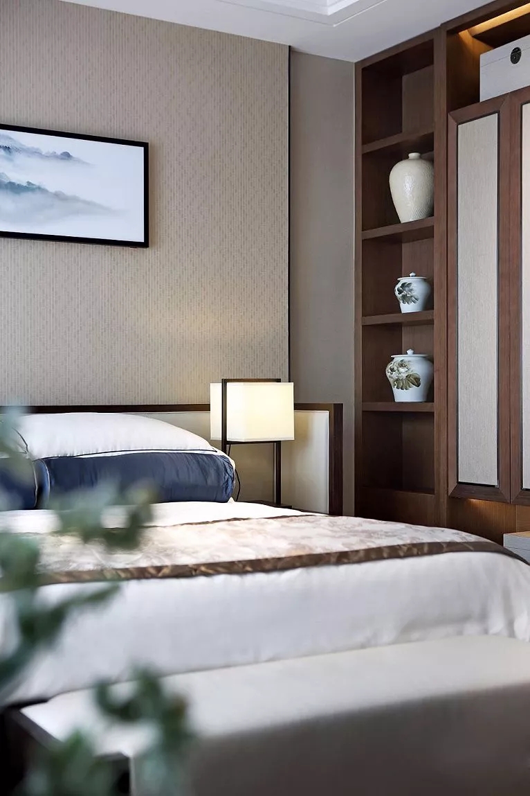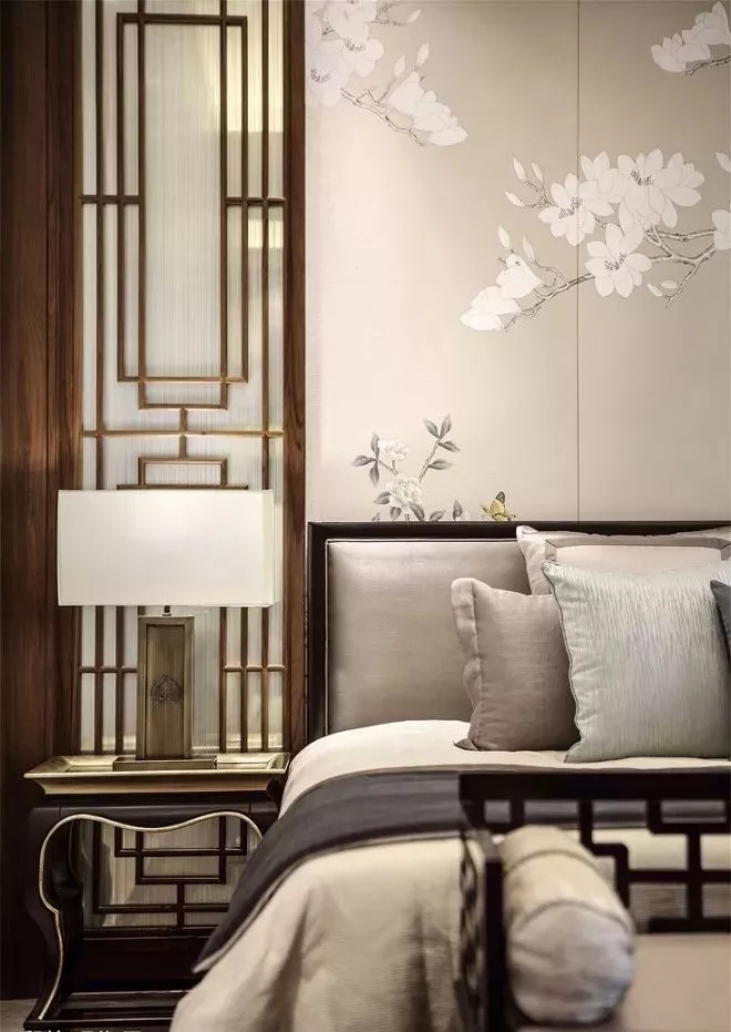 新中式卧室,在空间装饰上大多采用简洁、硬朗的直线条。