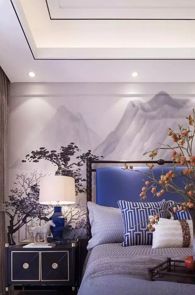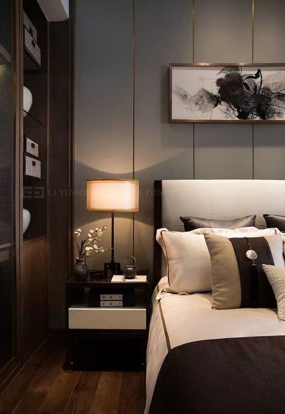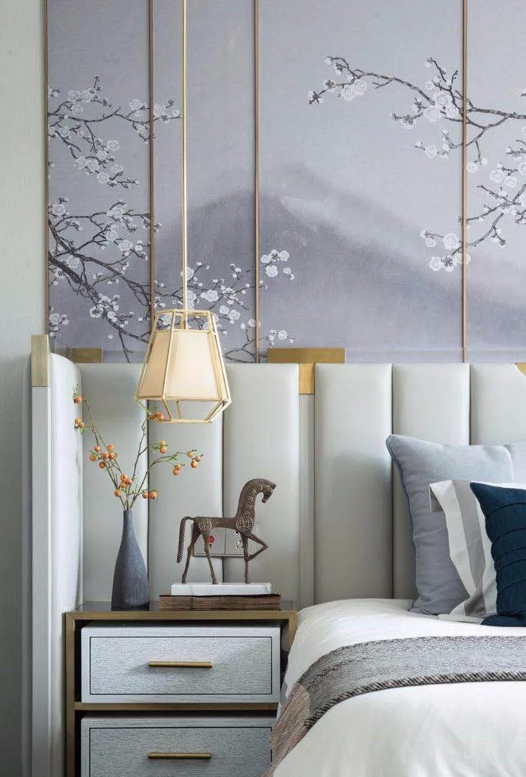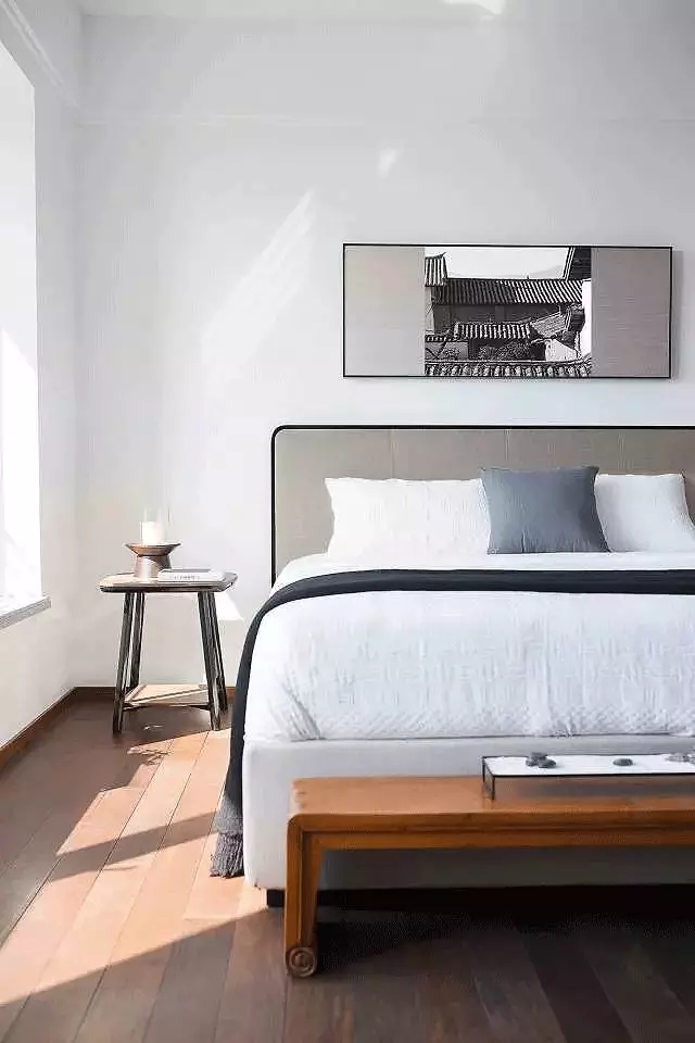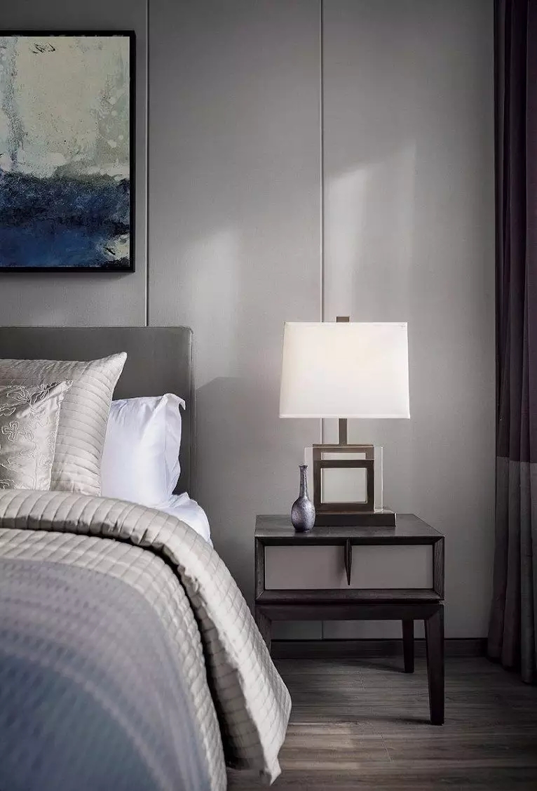 新中式卧室,在空间装饰上大多采用简洁、硬朗的直线条。