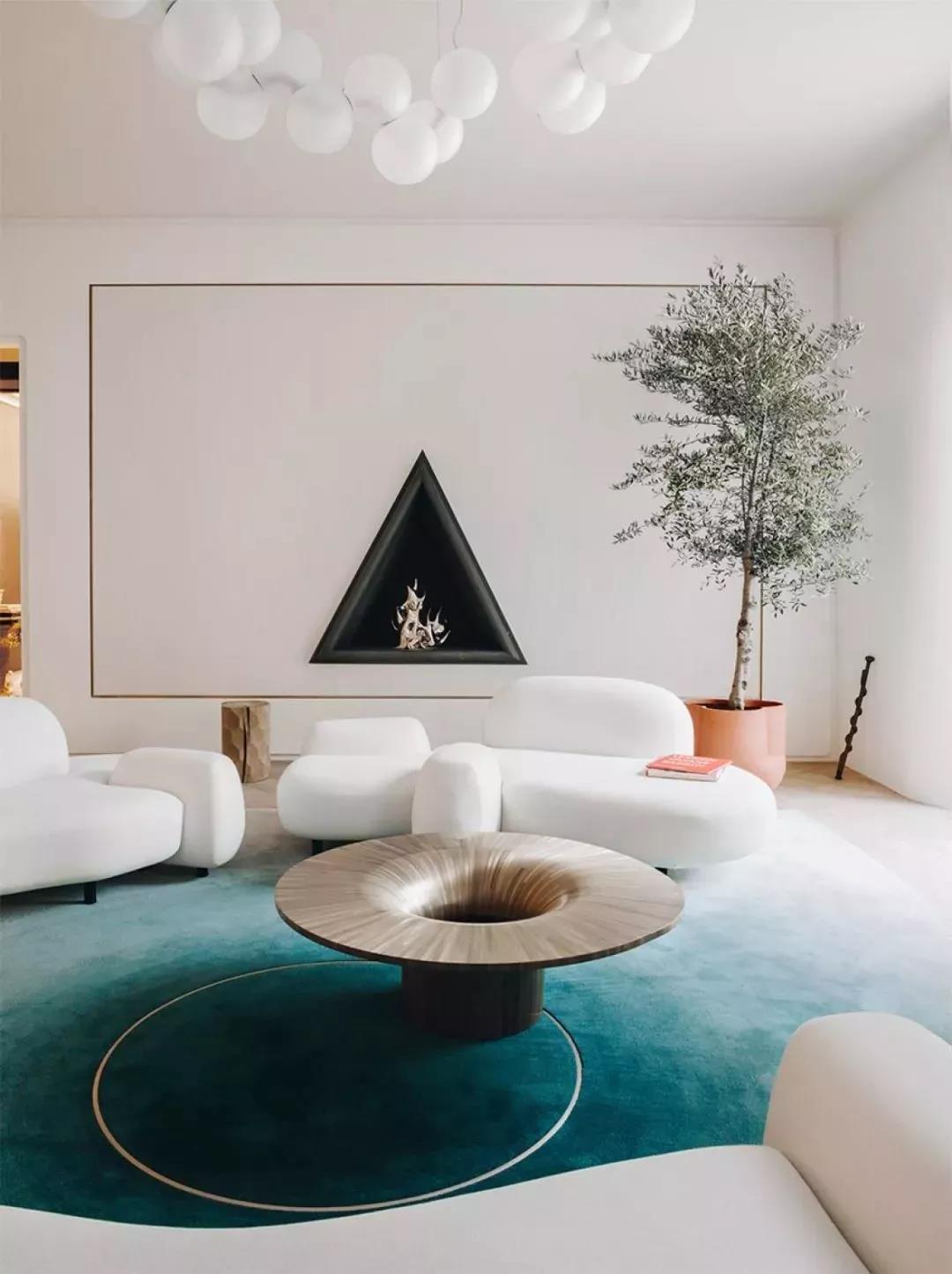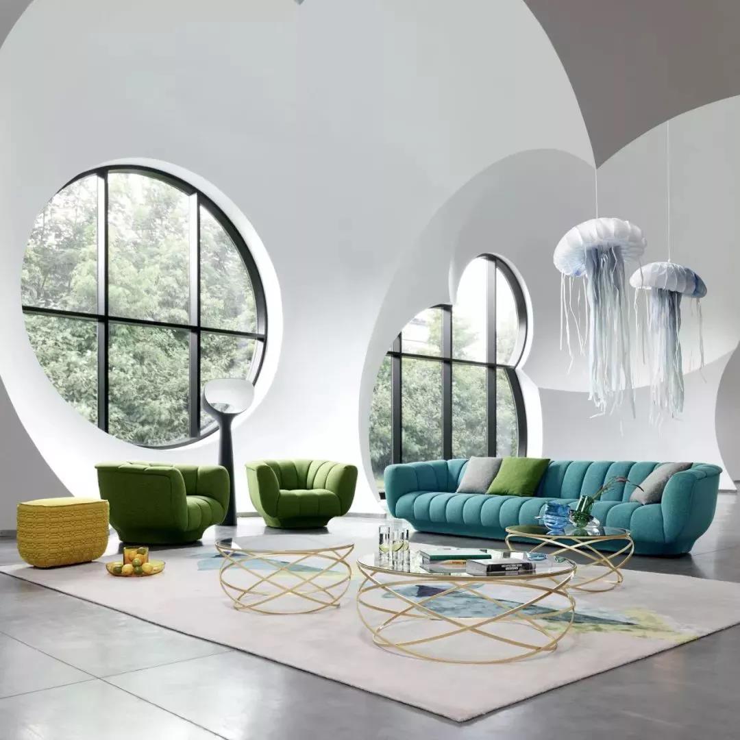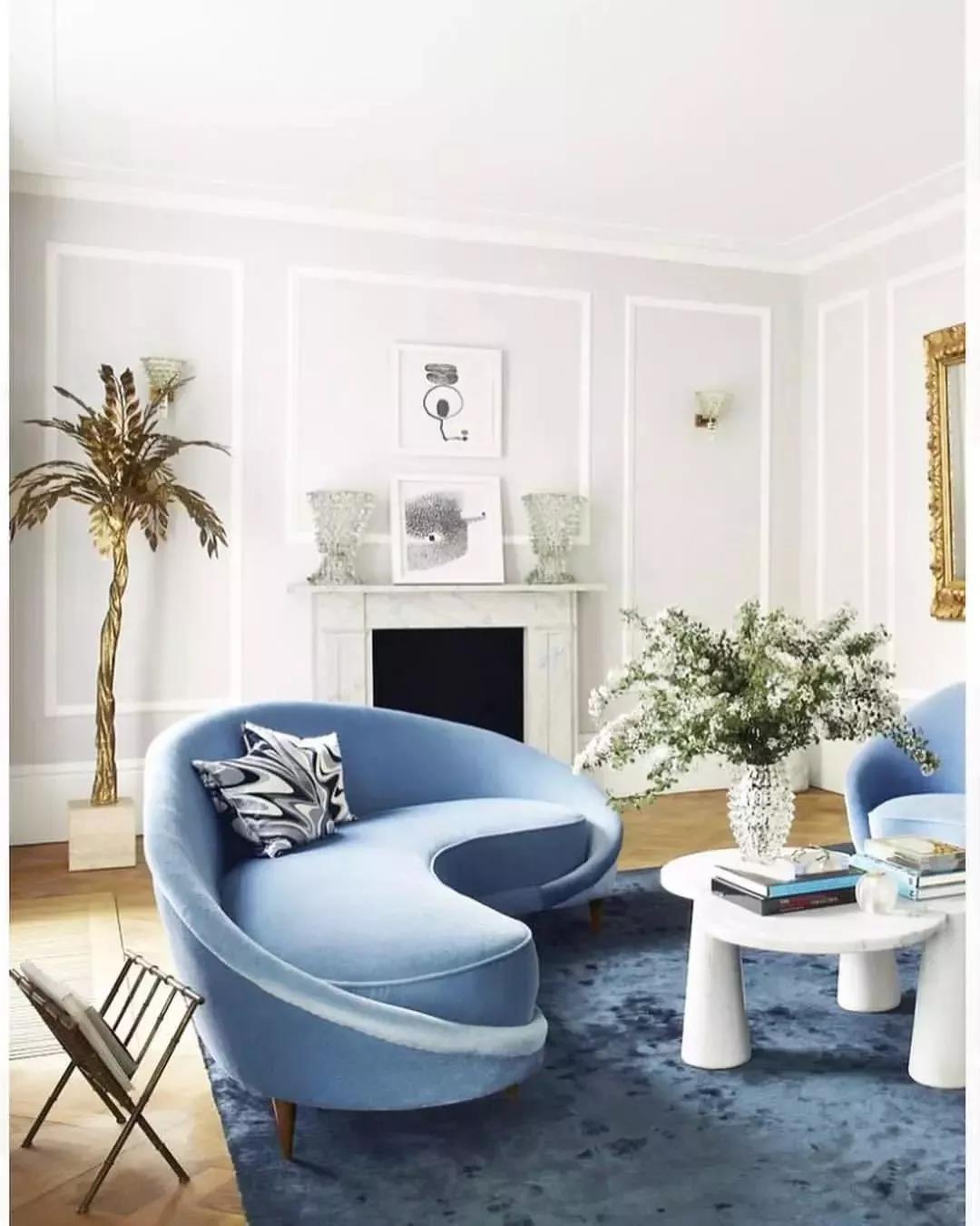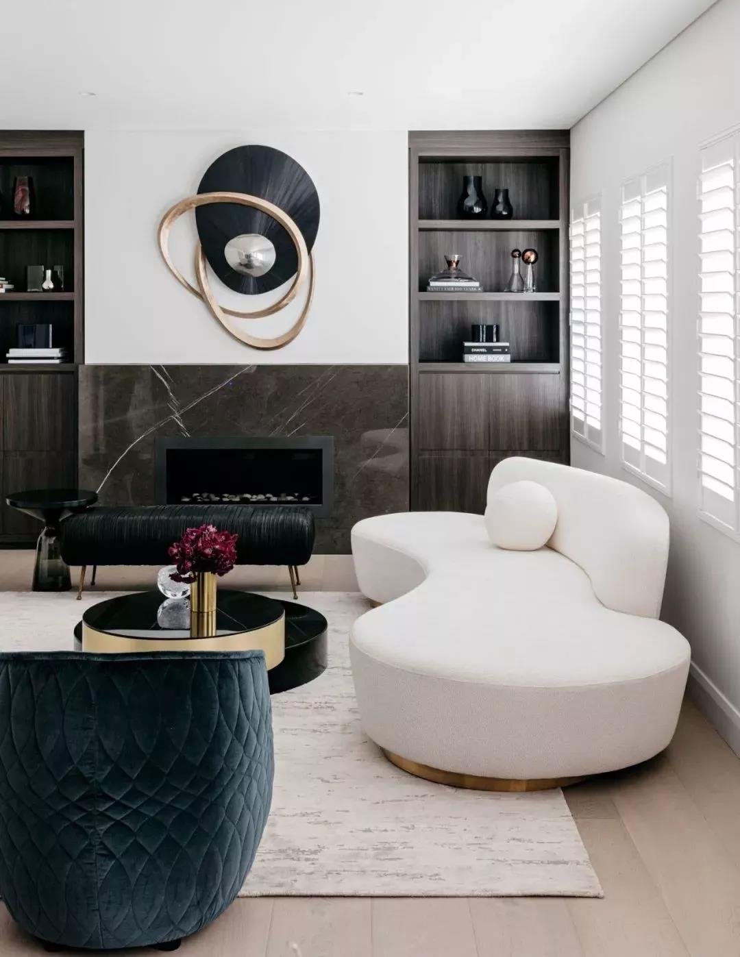 弧形沙发一般以围合的方式摆放,很容易营造出热闹、欢乐的氛围。尤其是塑造不对称空间或角落空间时,它能瞬间展现出时尚感。优雅的弧线造型打破了沙发一定要靠墙的传统,让客厅更有人情味。