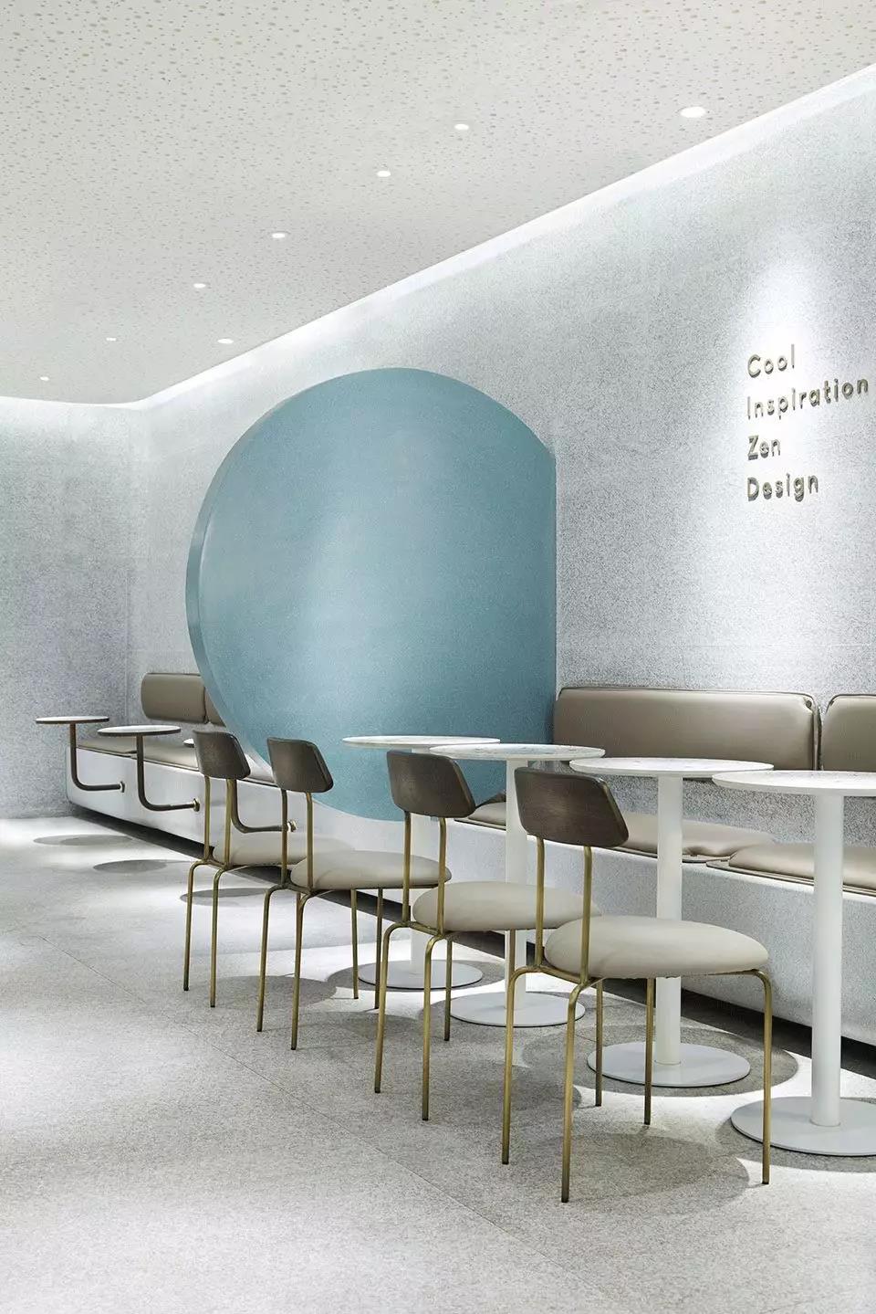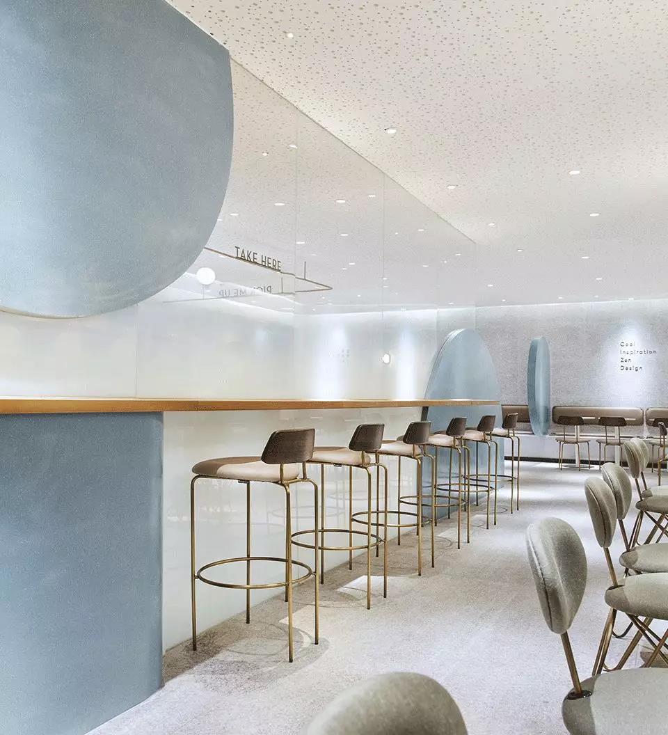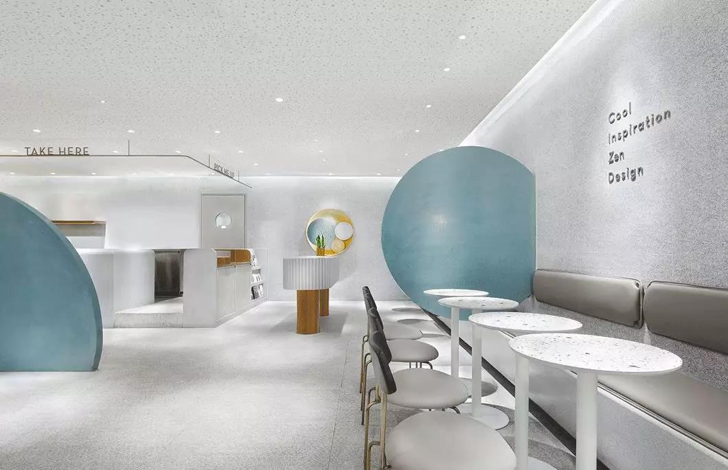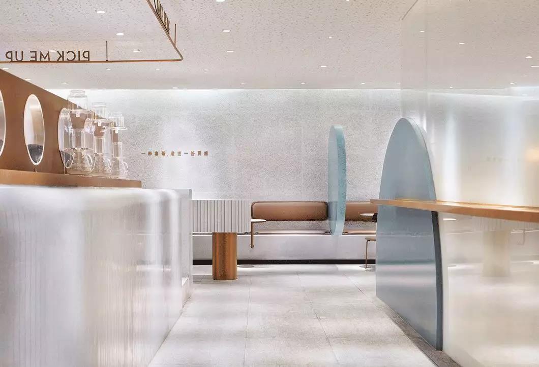 天花造型向下与吧台形成呼应,与面向两侧的定制座椅相结合,而圆形开孔处理让人联想到奶盖中的气泡,增加灵动趣味的感受并增强空间的社交属性。