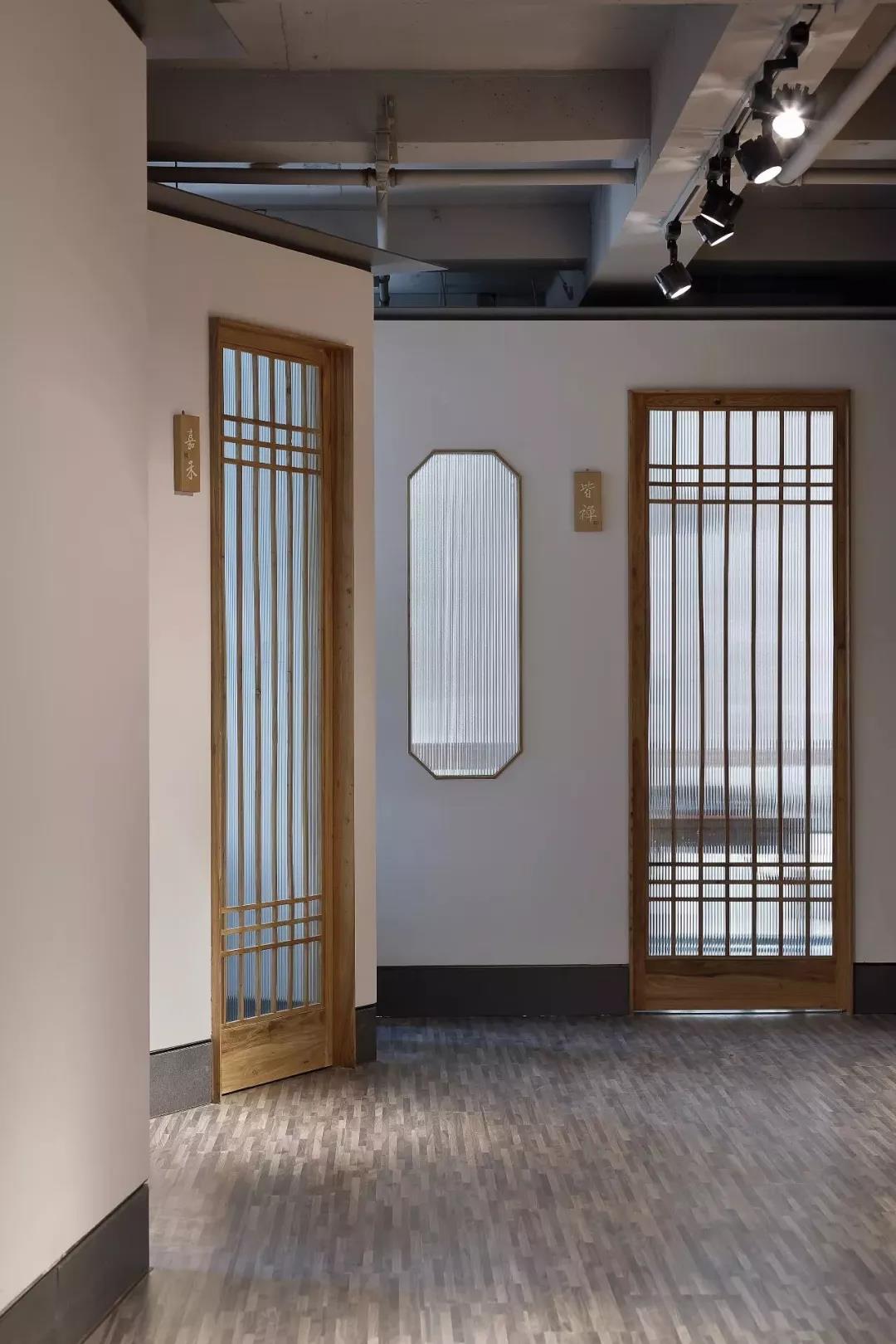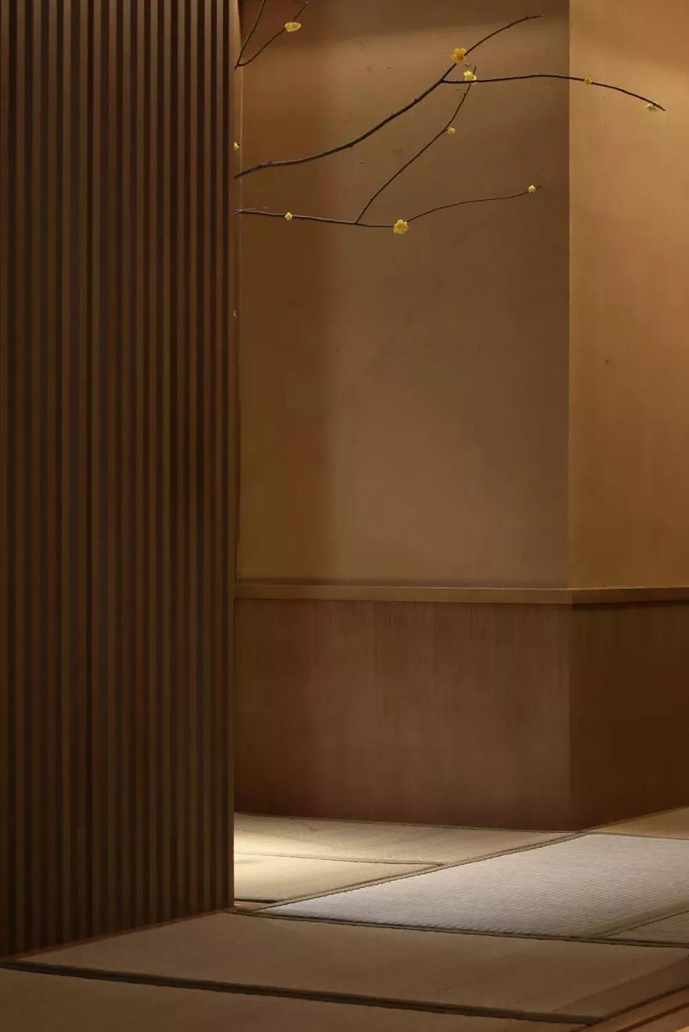如果说一楼是对日料仪式的致敬,那麽二层就是对实用空间的打造了。沿著线性的灯光,踏阶而上,伴随著左侧千姿态和风人偶的立面,仿佛用一种方式叙述著日式对客人最高的欢迎礼。右侧条型隔栅组成的扶栏结合著光影,客人通过的过程,光影斜射,树影婆娑,刹那间你已是景中之人。