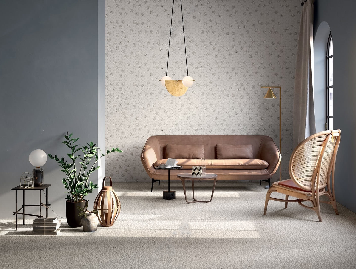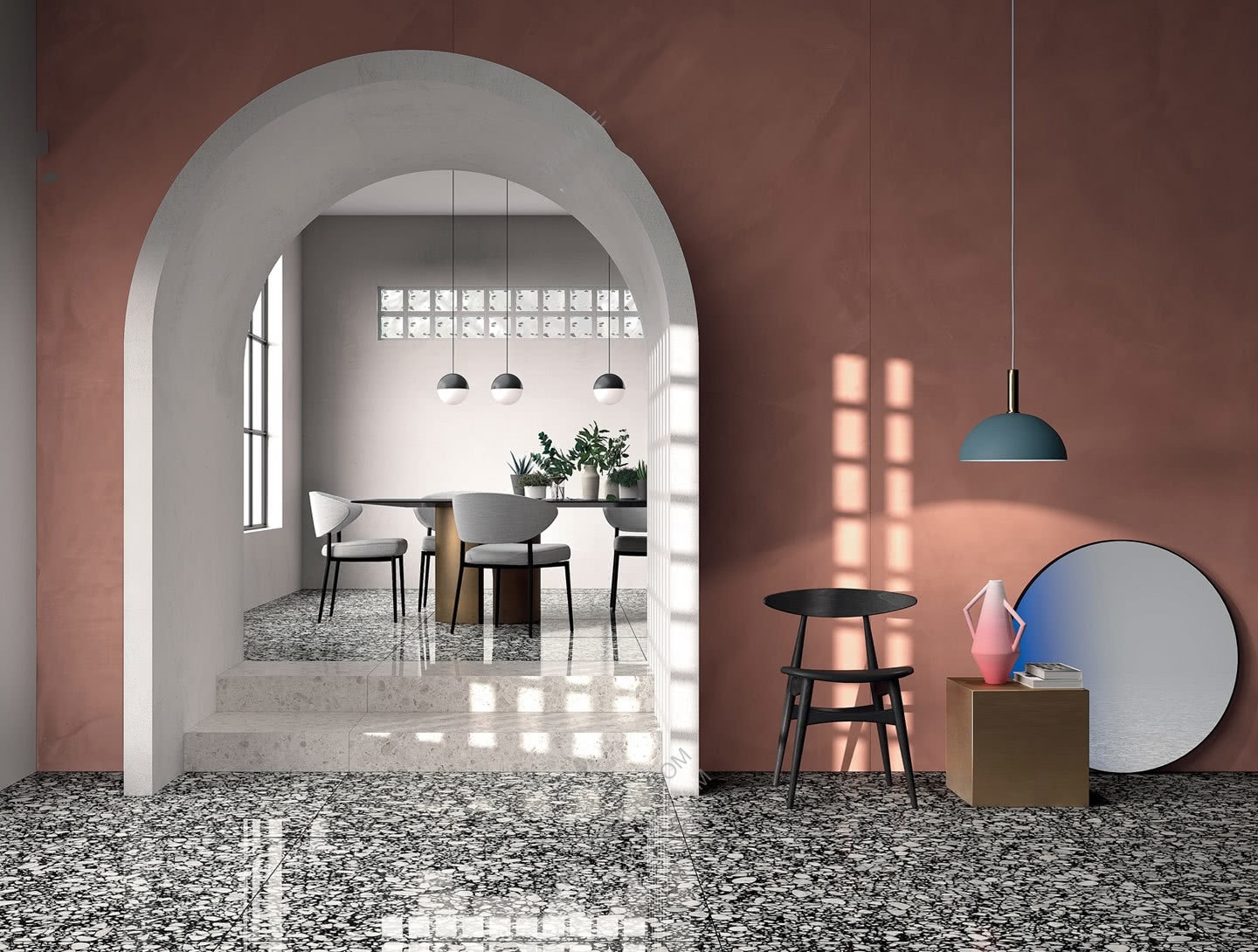 意大利瓷砖品牌FONDOVALLE的Shards系列受意大利经典设计威尼斯水磨石瓷砖的启发,具有两种不同的纹理,其中石头,陶瓷和大理石的碎片与水泥和石灰混合在一起,形成了独特的混合物,具有不均匀的外观和多变的纹理。