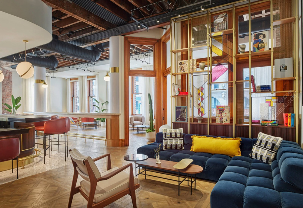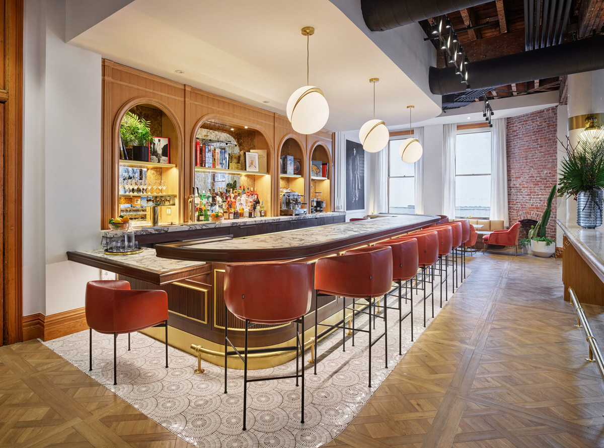 在酒吧,NeueHouse的共同工作人员坐在大理石顶吧台旁的玫瑰色凳子上,可以一边享用咖啡或鸡尾酒。LEE BROOM设计的球形吊灯悬挂在头顶。
