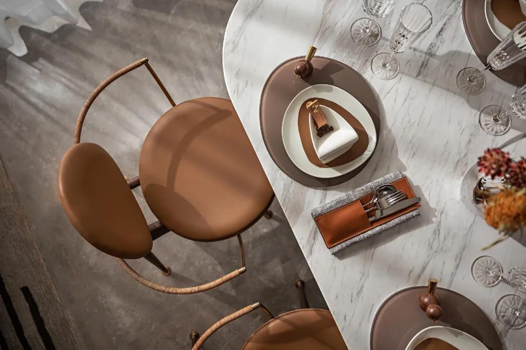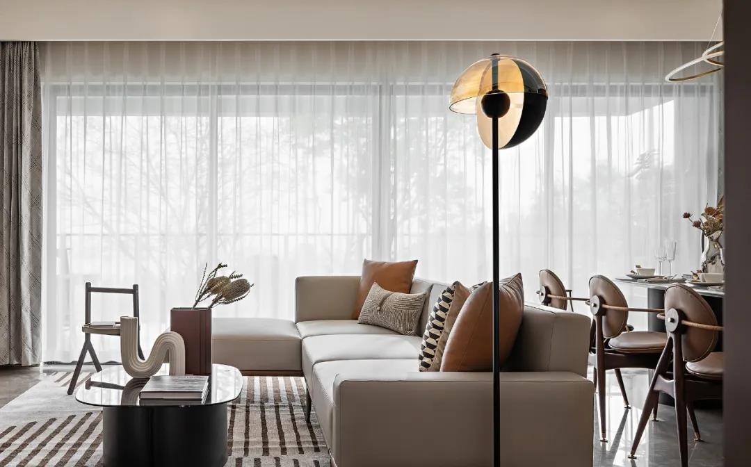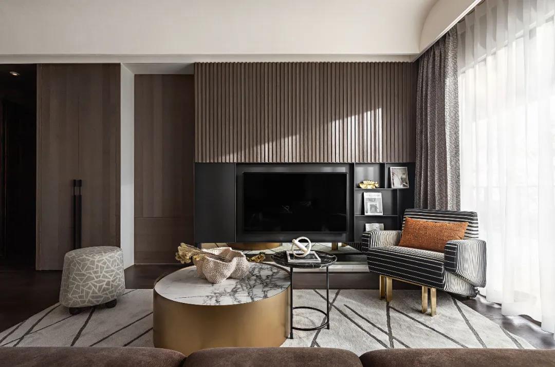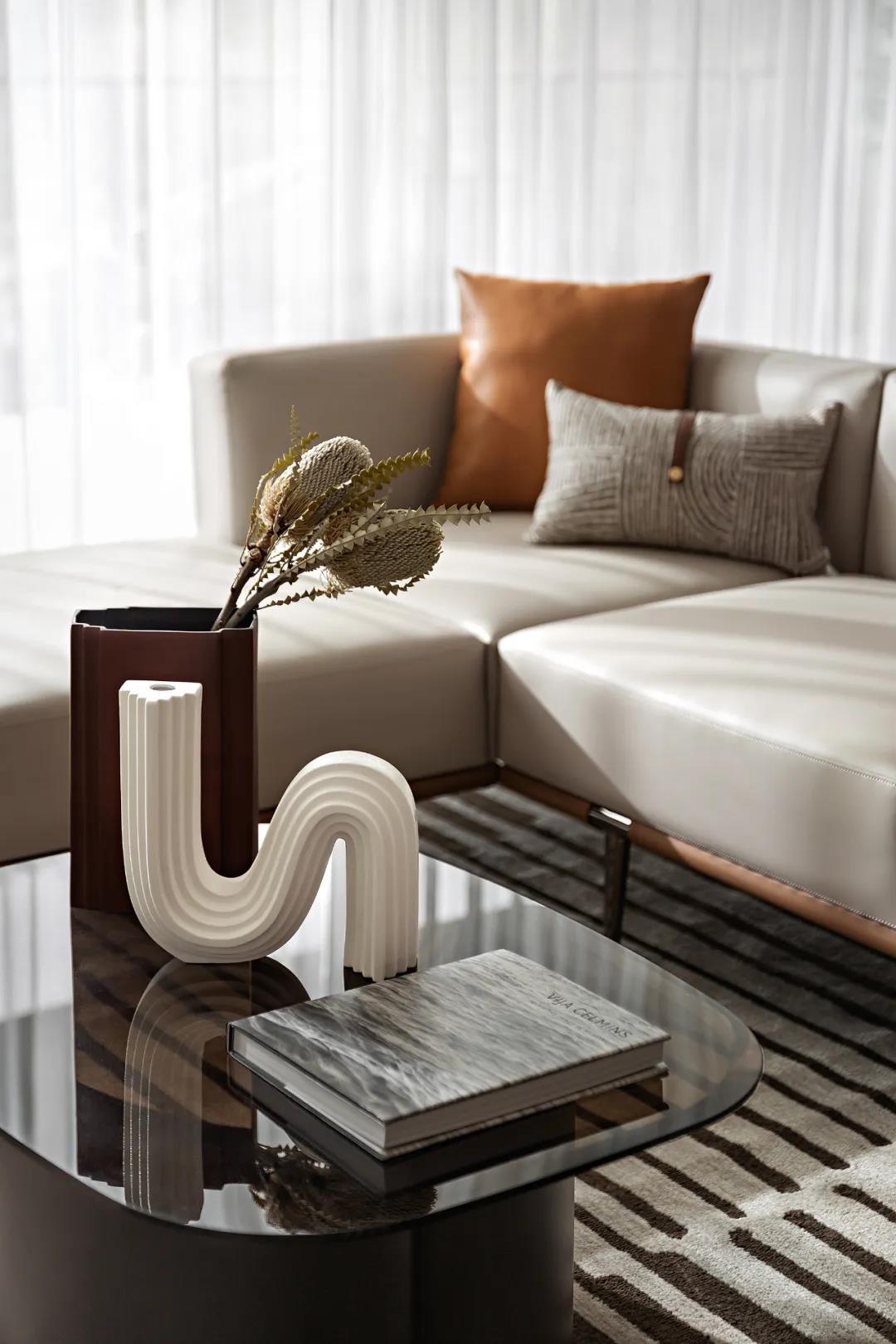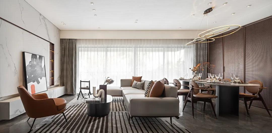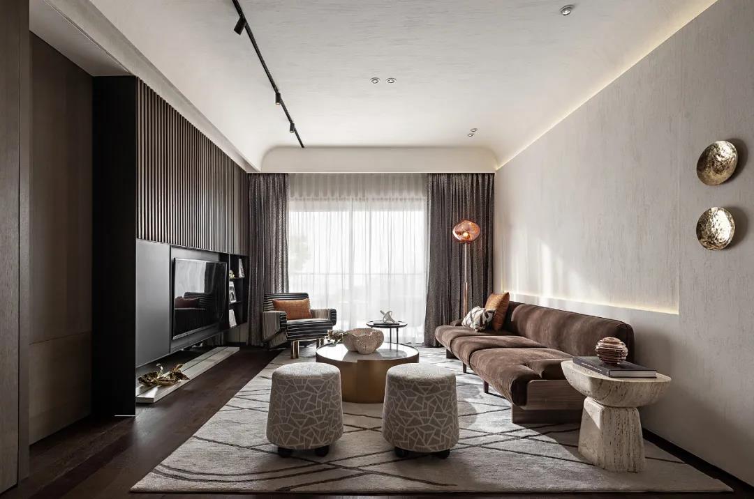 本案设计将“秋色”作为情境营造主题,选用暖咖色皮革作为勾勒空间的灵魂元素,再加以原木、金属、布艺、天然石材等质感相异的材料进行有序的配搭,使空间色调主次分明,冷暖谐和。极具设计感的灯具、雕塑、挂画看似随意的添置,为空间增添不凡的艺术气息,整体空间理性中不乏精致。