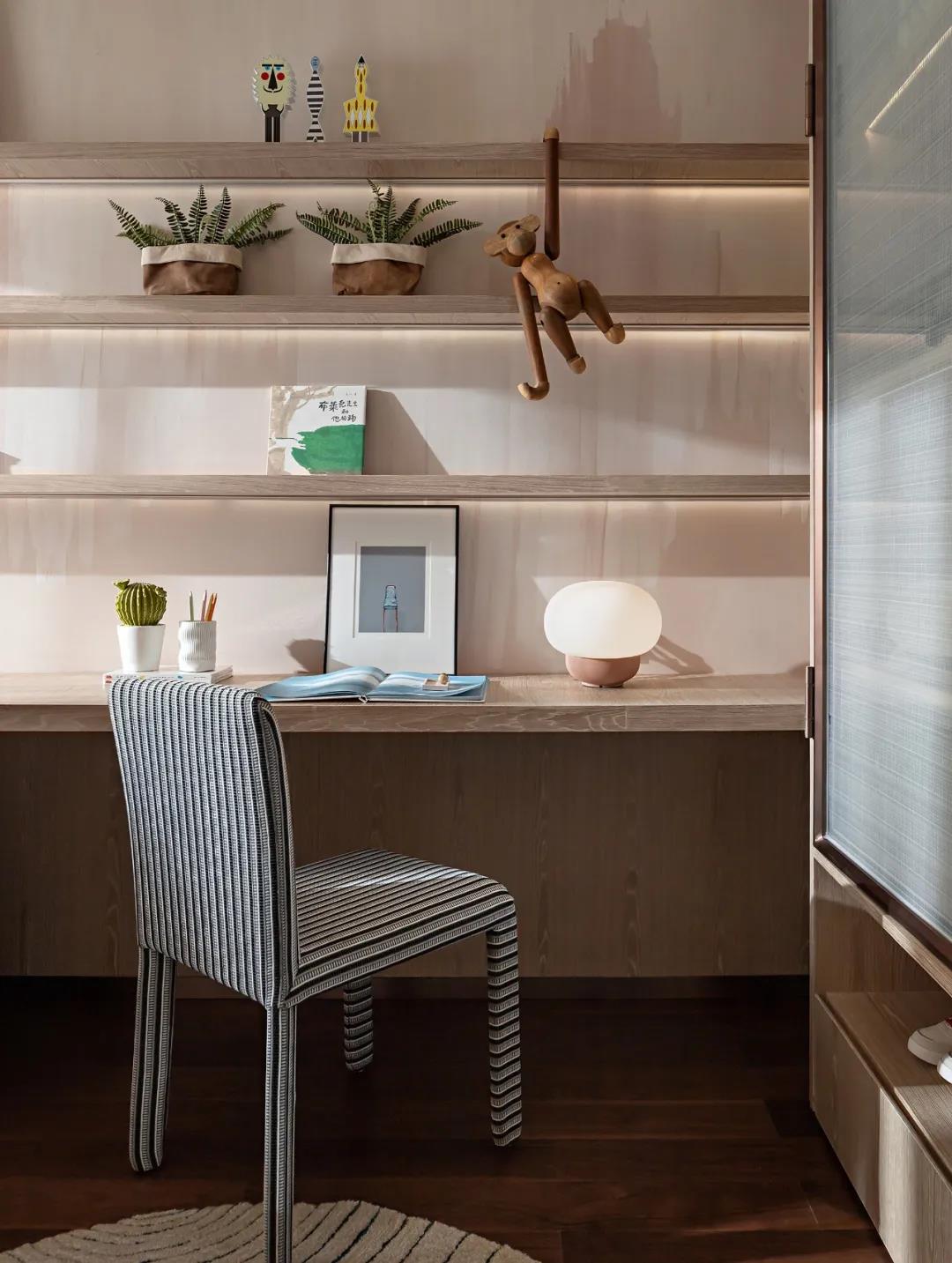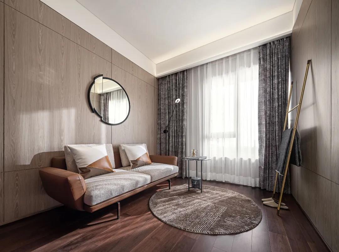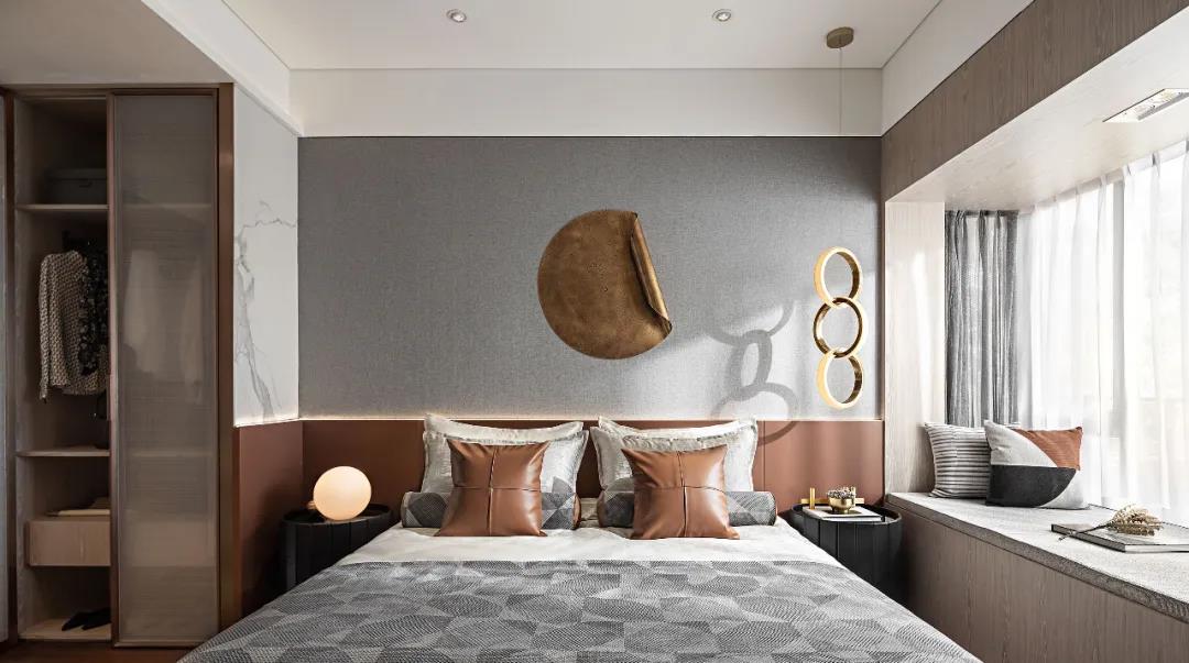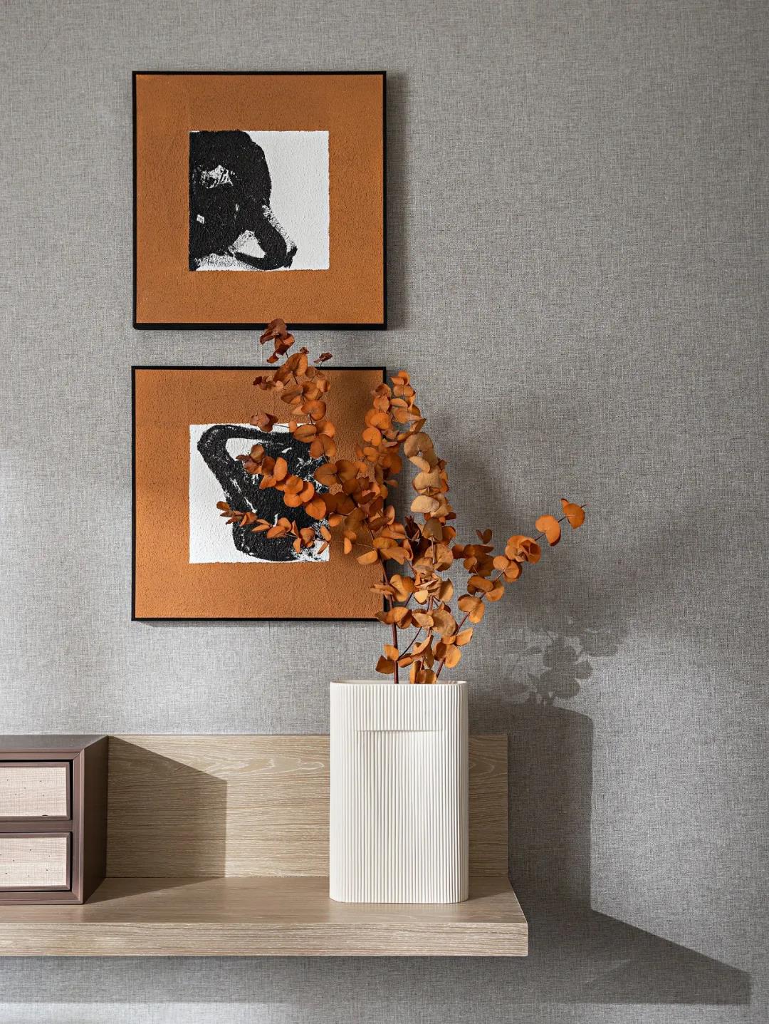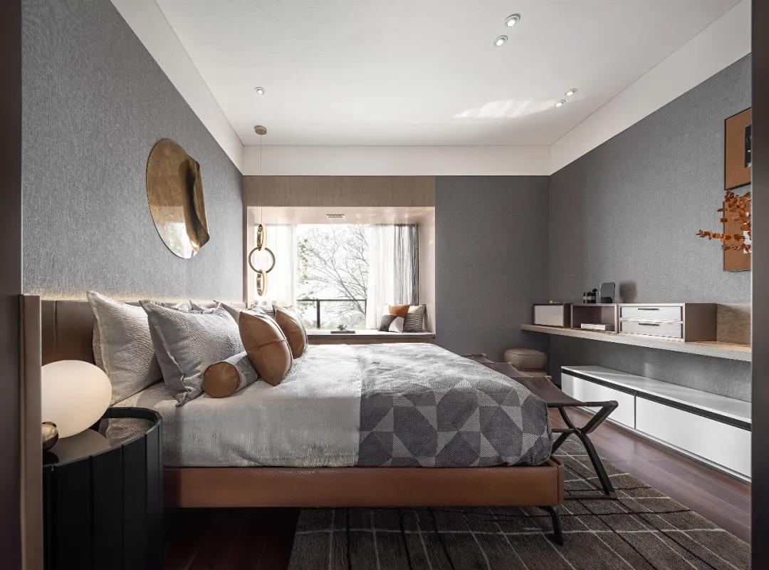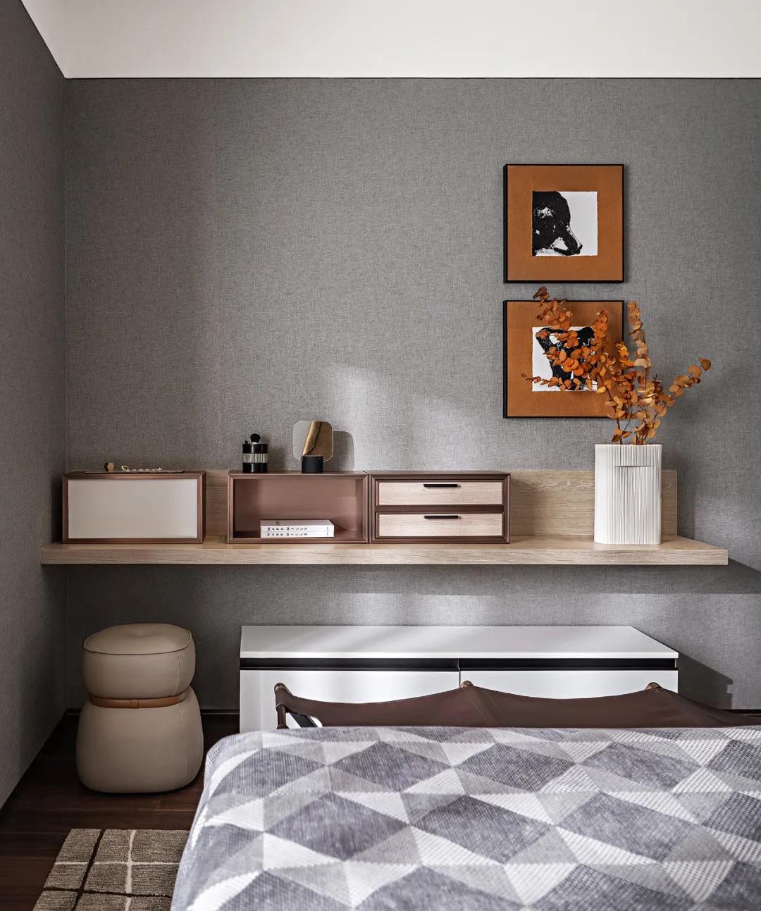 主卧以诗意化的意象铺叙,令空间气质在光影的映照下,呈现俊雅幽然的精尚感。不同饱和度的灰色调被加入其中,在调和空间亮色的同时为空间注入一抹宁静;而落落黄叶的点缀,则将空间的情调氛围推向更浓郁的表达中——秋意渐浓,心中的浮躁亦可随风渐止。