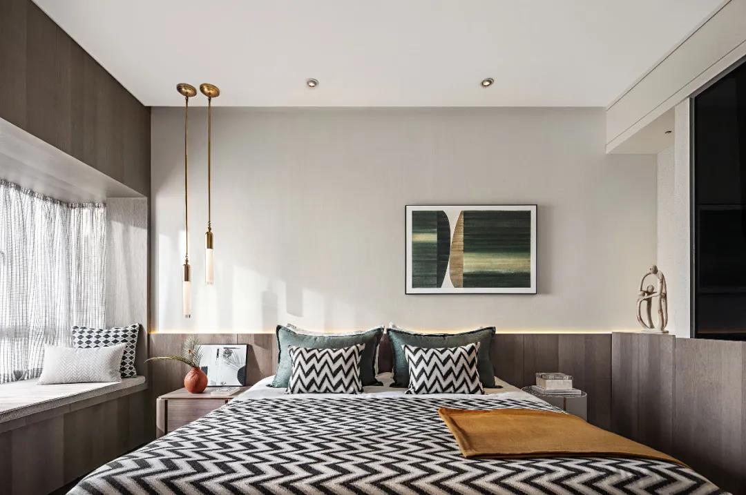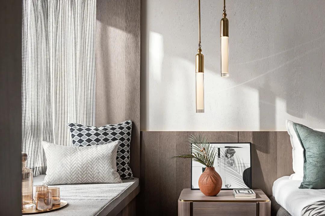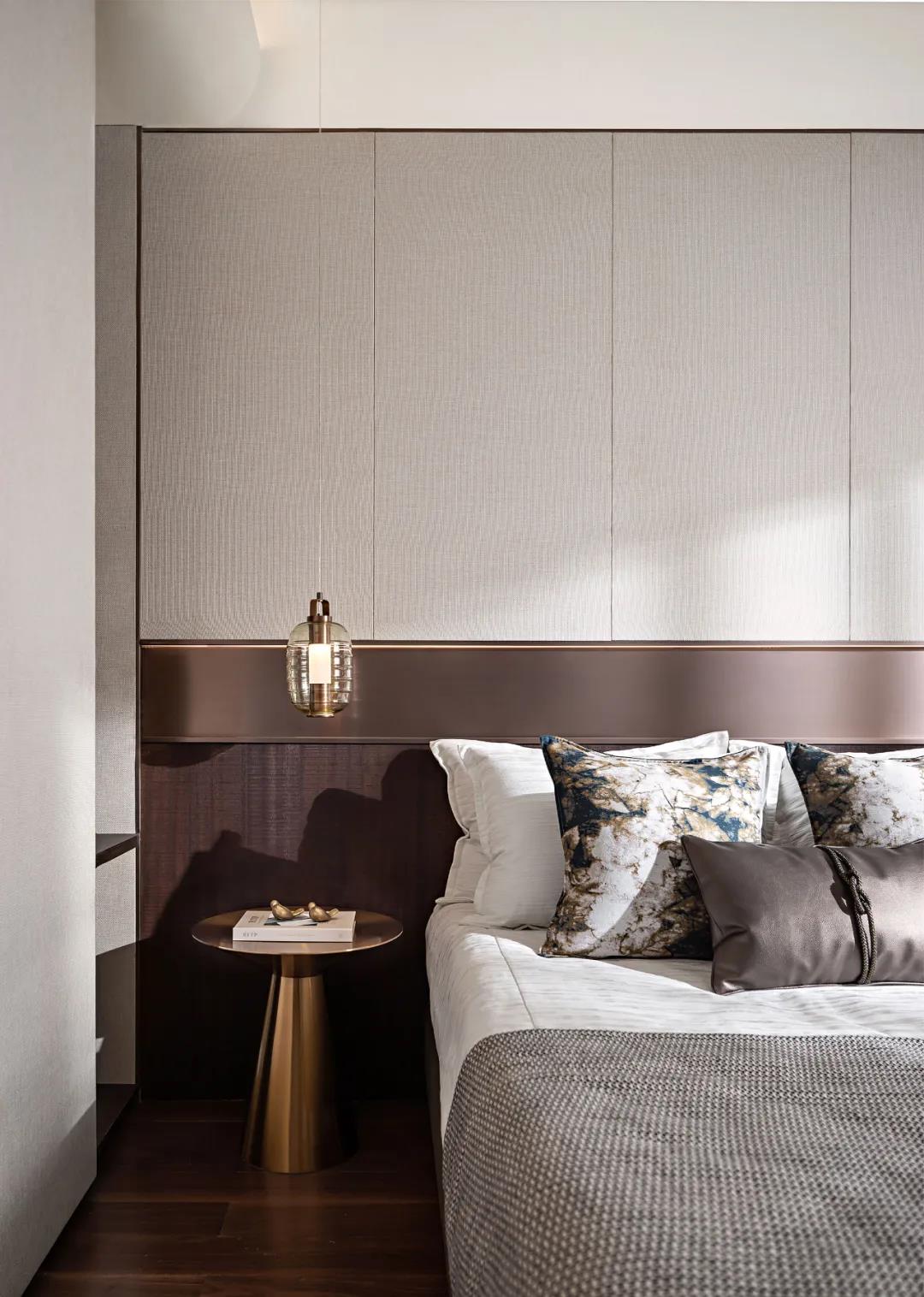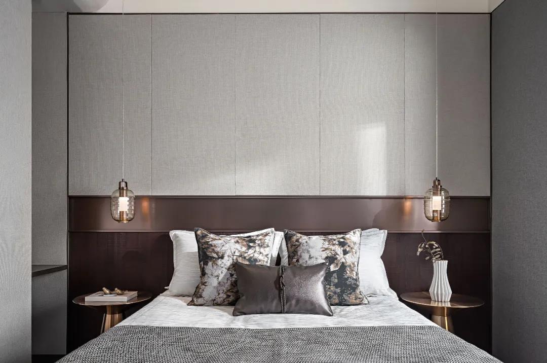 次卧的意境凝练着属于深秋的美,于低调的表达中缓缓呈演出高雅的精神魅力。边桌、吊灯、挂画等精致软饰的运用,为空间增添一份灵动,也彰显出居住者一定的生活品味。