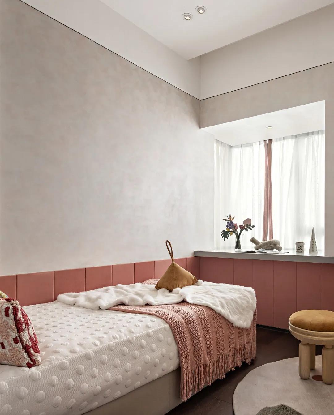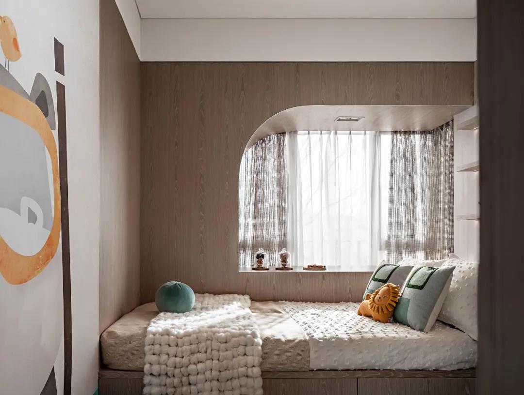儿童房的设计,除了以童趣梦幻的色彩营造居住氛围外,还在多个细节处体现人性化考量。为保障孩童的健康与安全,设计特别选用温润细腻的天然木质与柔软舒适的布艺作为主材料,而弧形的飘窗顶部设计,也贴心地为孩子好动爬高的天性打造一把“保护伞”。