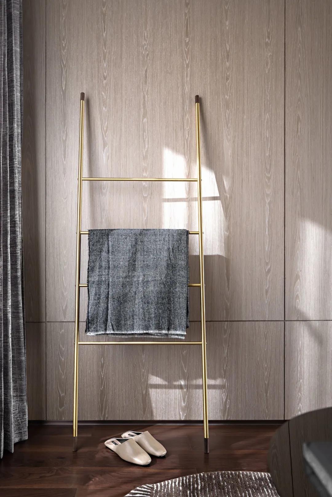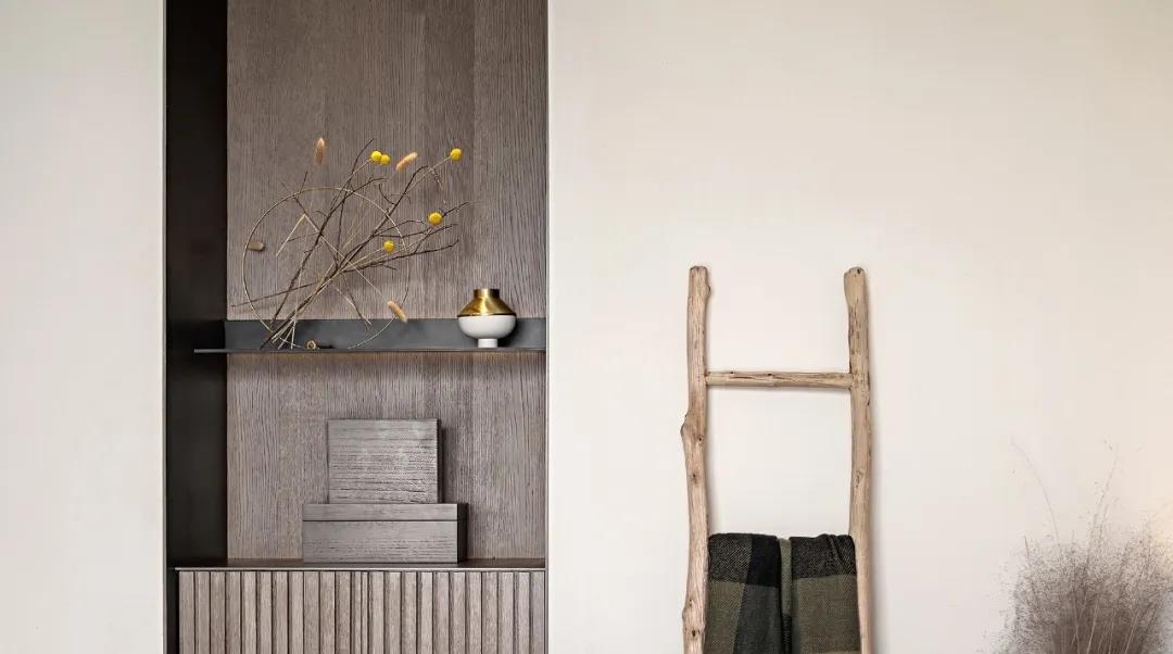 原木梯型置物架与风干植物、自然石材、条纹布艺的搭配运用,为空间注入了有趣的律动,同时也赋予空间一种旷野之美,让人仿佛置身于户外原野之中。设计师运用简单的陈设手法营造自然之美,这也是本案最大的亮点之处。