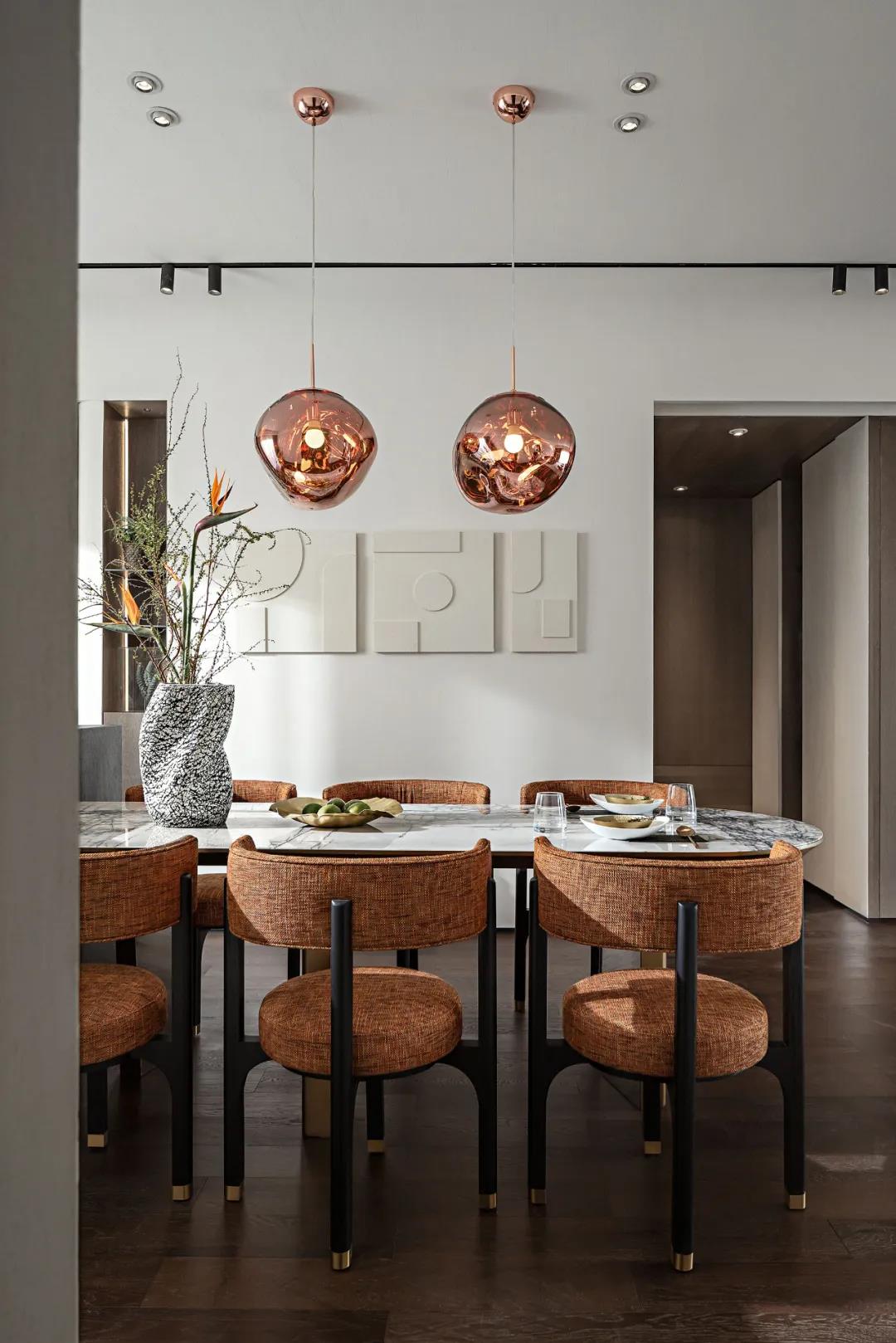 餐厅以白色墙面背景划分出与客厅的界线,两种差异化色调在对比中形成有趣的空间对话。暖橘色跳跃于白色空间之中,为空间构建一处视觉焦点,同时也增添了一份灵动与俏皮。同一系列的两款灯具分别出现于客厅与餐厅中,遥遥相望,相互呼应。
