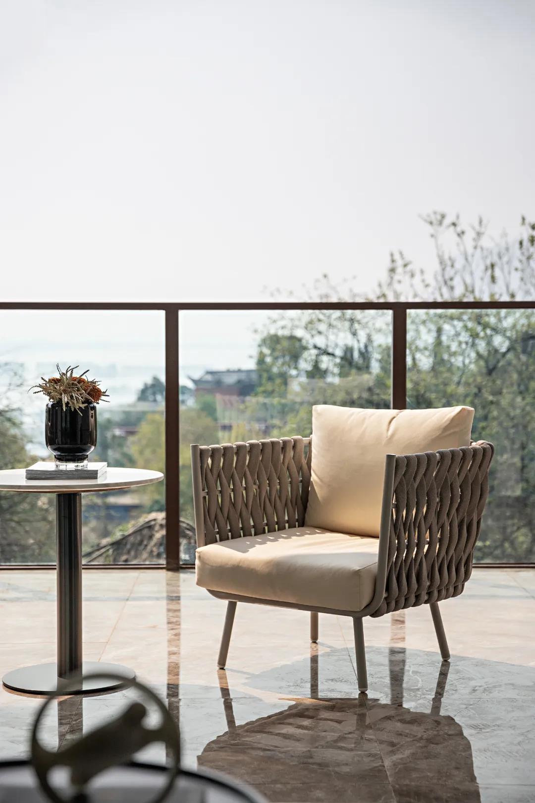 开放式的空间布局纳入更多自然清气,空间通透而明亮,线条分明的白色皮质沙发与少量黑色金属元素的桌子、灯具搭配相得益彰,居者静坐室内也可欣赏到窗外的绿意山景,若遇上昆明的雨天,山雨朦胧,便得以领略一番“画堂人静雨蒙蒙,屏山半掩余香袅”的意境之美。