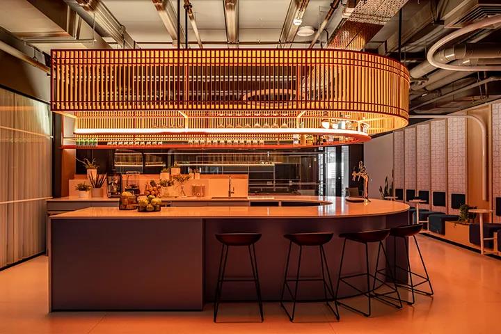 在本项目中,设计团队打造了一处员工俱乐部,周围环绕着会议室和灵活的开放空间。办公室的中心地带是一处与工作无关的员工活动区域。在这里,大家可以从容不迫的进行社交活动。这种氛围与在走廊或小型厨房举办的临时会议有所不同(由于工作是在家里完成的,所以这种会议不会频繁发生)。