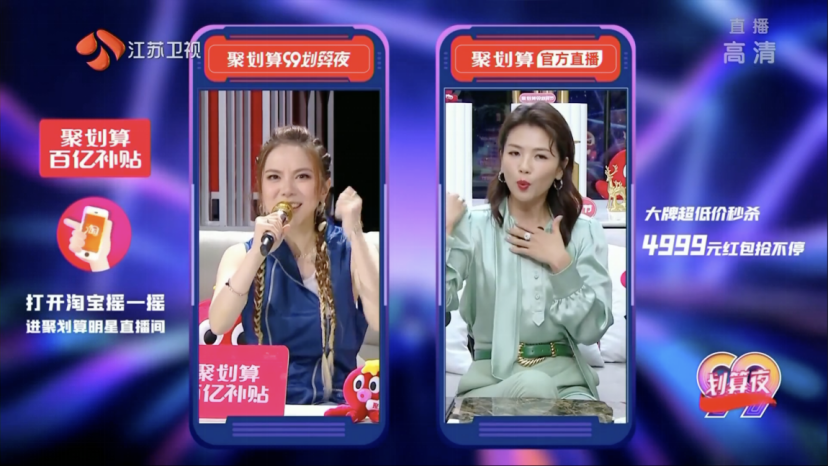 区别猫晚的综艺狂欢,江苏卫视与淘宝联合打造的全网首个全明星晚会——聚划算99划算夜,则邀请明星进入直播间,进行沉浸式体验,并以一大一小两屏的呈现,为用户带去福利+好物推介的购物欢乐。
