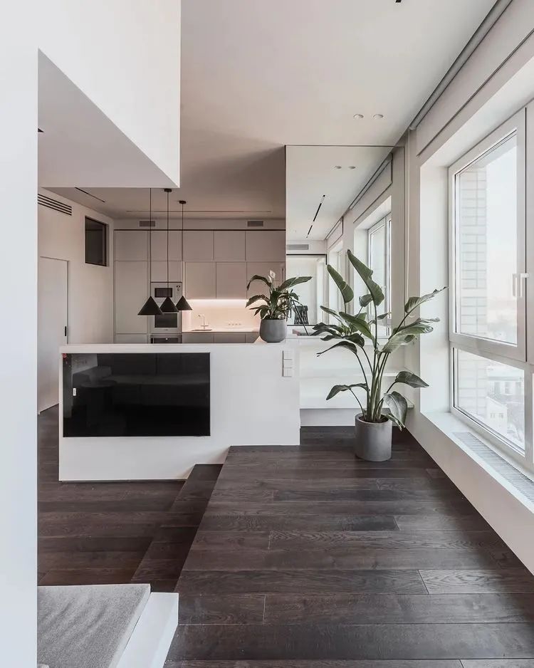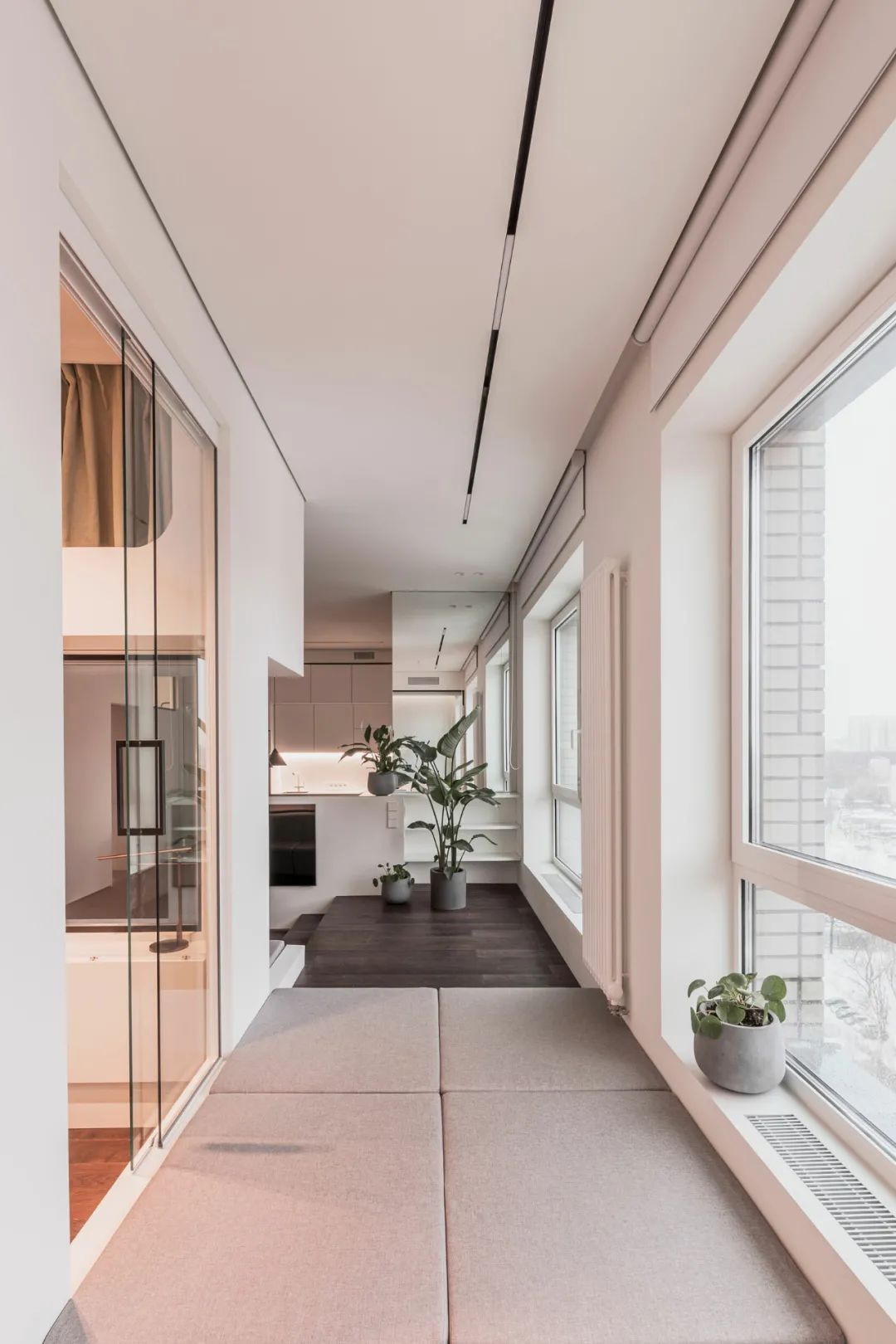公寓的最大优点是其中一堵外墙上有4扇大窗户,对我们来说,保持这些窗户沿线的空间完整是非常重要的,而不是用空白的墙壁分隔它。因此,沿着窗户出现了一个单独的休闲区,所有的房间也都是面向的。