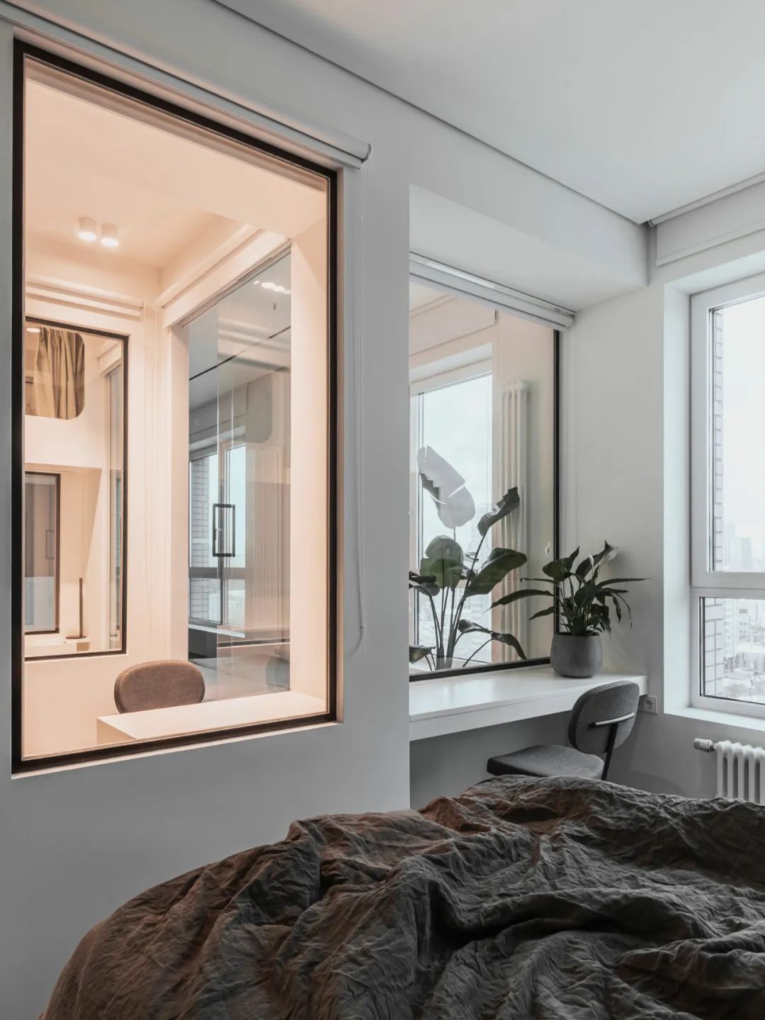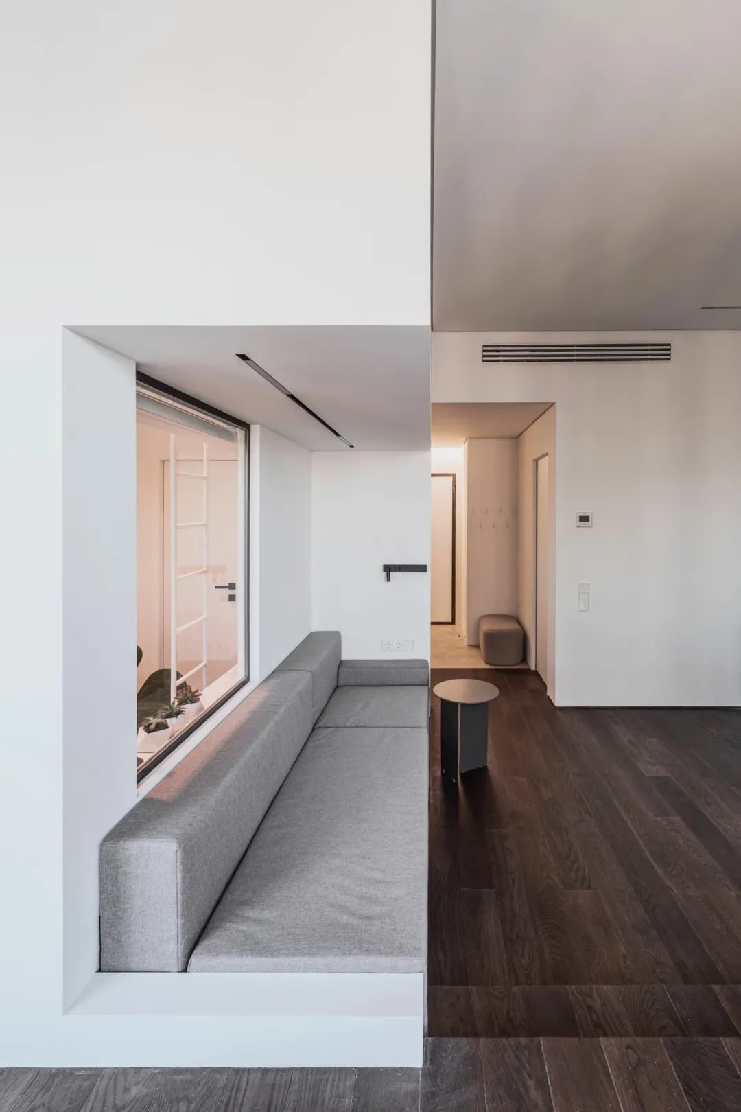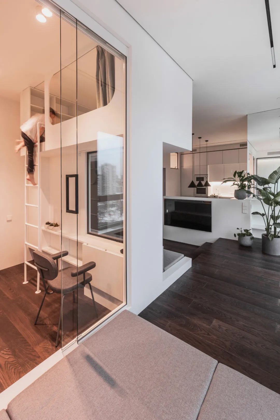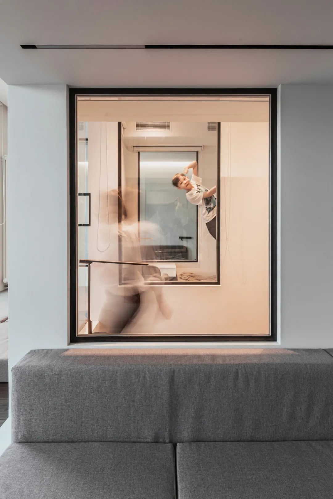 中央体量划分了公寓的整个空间,包括两个儿童房、一个客厅和一个休闲区。在内部隔断上设置了窗户,因此公寓在所有房间中都是可见的。所有室内窗户都配备了卷帘,这样你就可以完全将你的区域与其他人隔离开来。为了增强这些窗户的隔音效果,在具有U形截面的复合铝型材中使用了Triplex6+4。