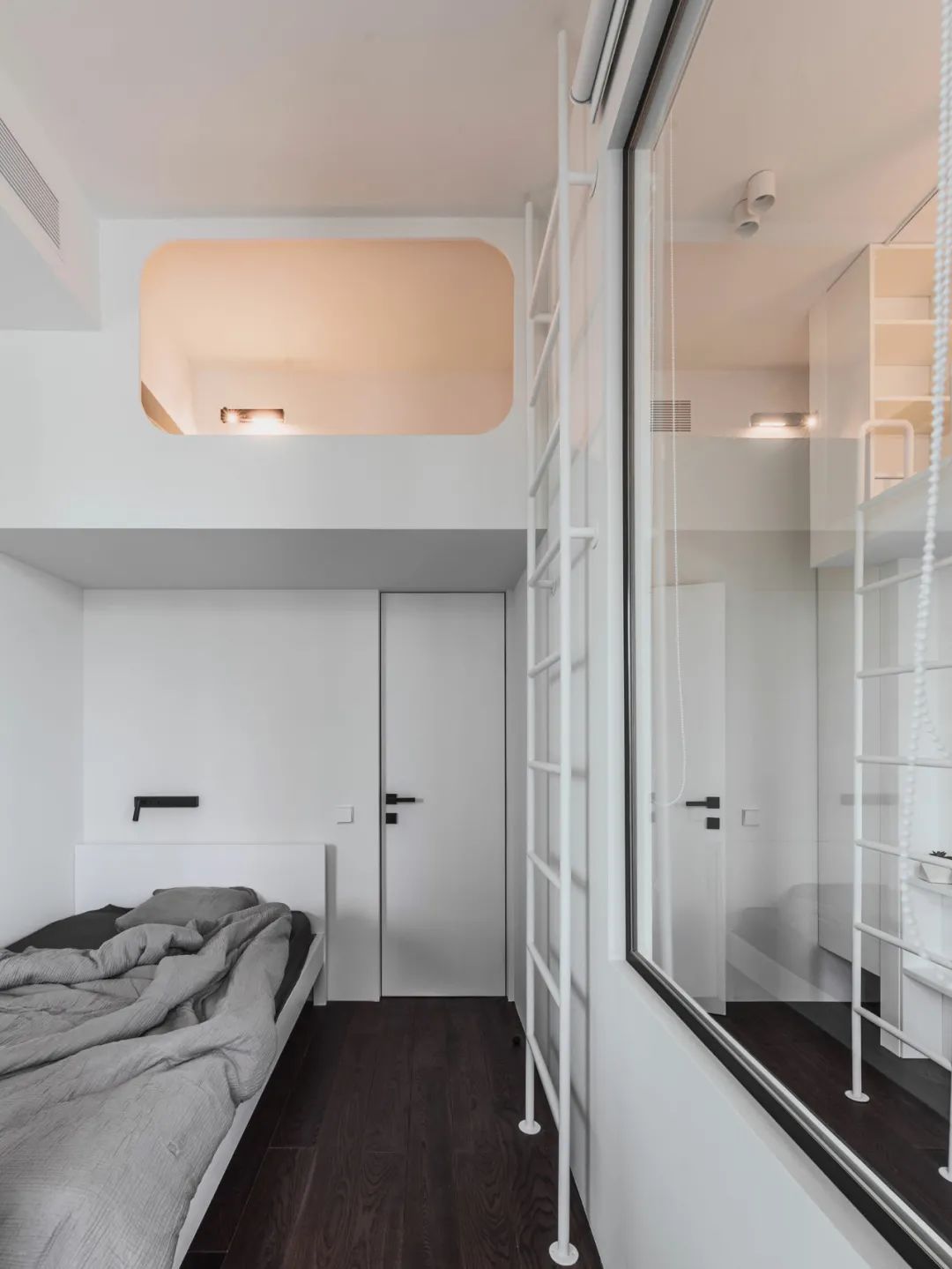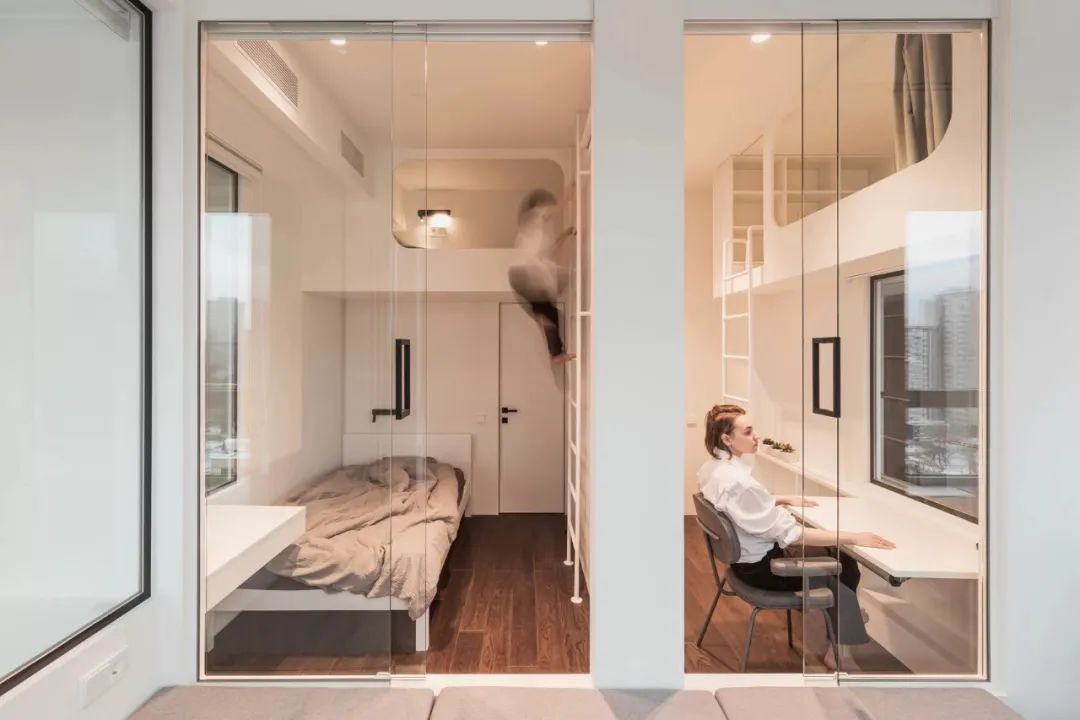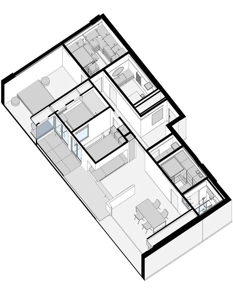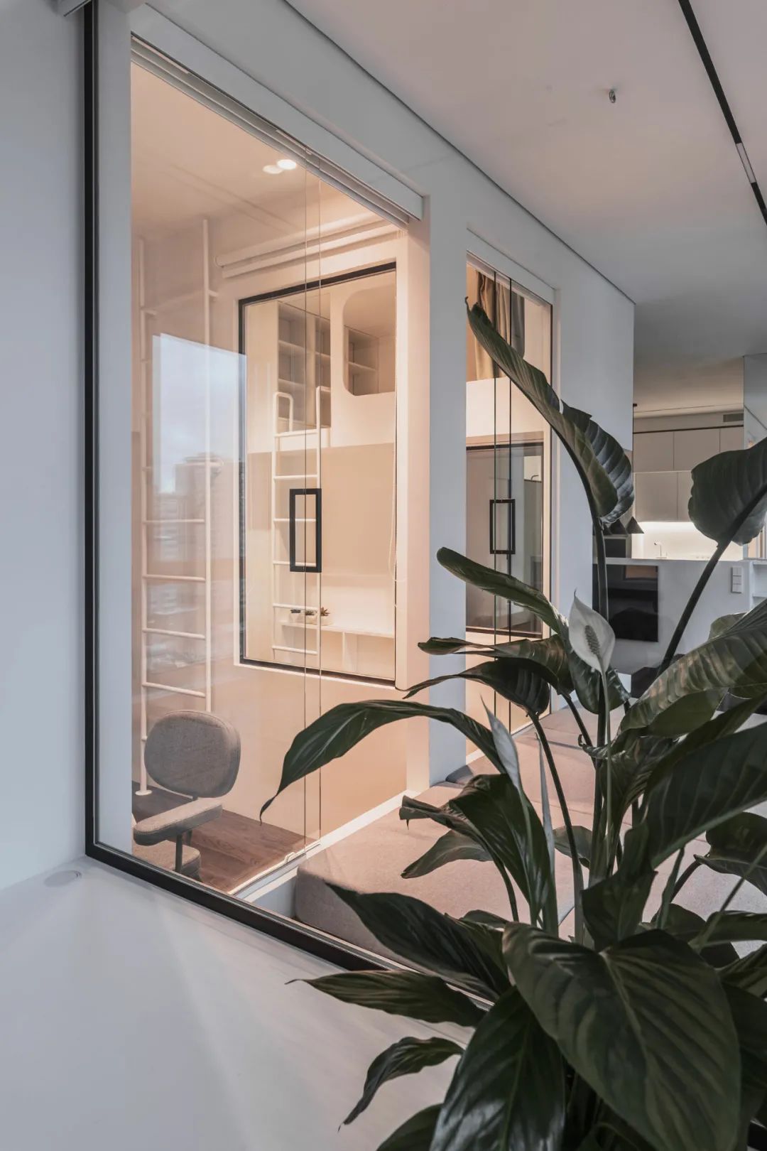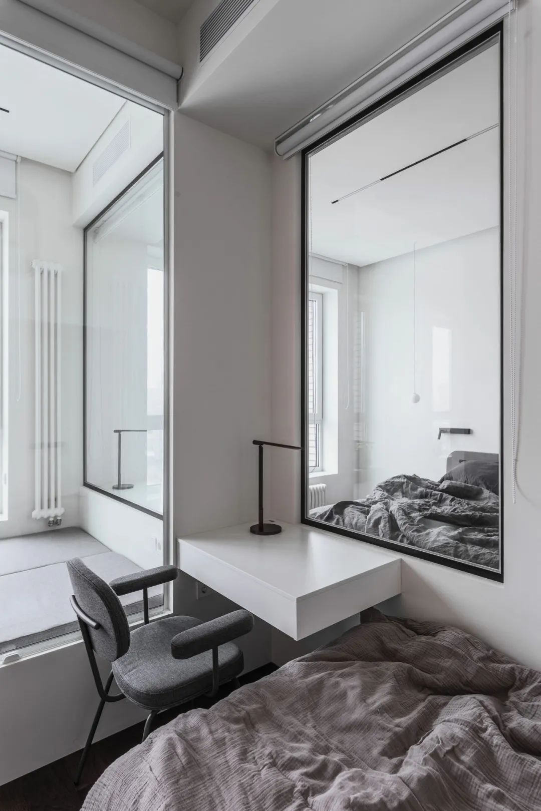 中央体量划分了公寓的整个空间,包括两个儿童房、一个客厅和一个休闲区。在内部隔断上设置了窗户,因此公寓在所有房间中都是可见的。所有室内窗户都配备了卷帘,这样你就可以完全将你的区域与其他人隔离开来。为了增强这些窗户的隔音效果,在具有U形截面的复合铝型材中使用了Triplex6+4。