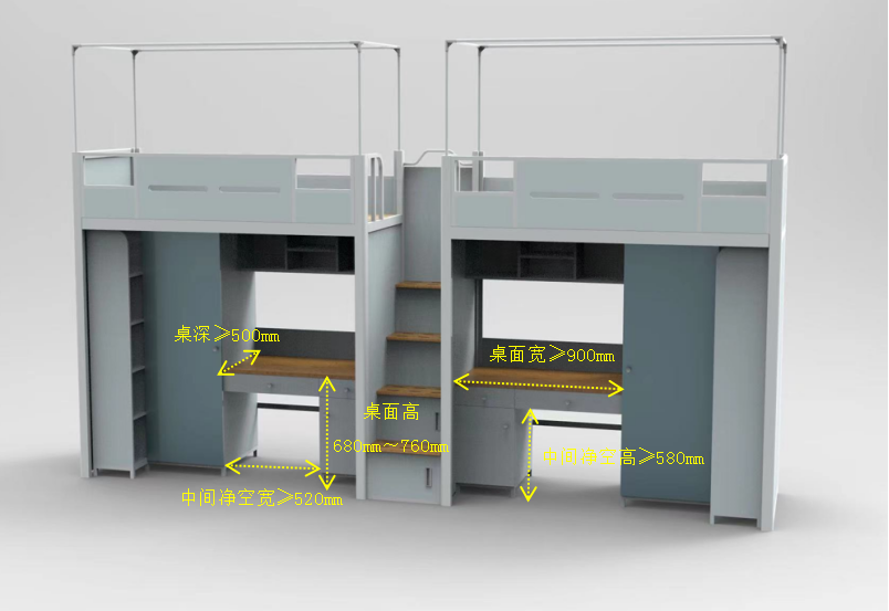 联体型是指两套以上(含两套)单体型连接在一起的学生公寓多功能家具(如下图所示)。