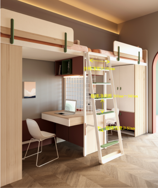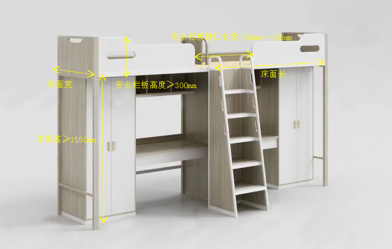 再次是对床的尺寸要求。要求床铺高不小于1550mm,安全栏板的缺口长度在500mm~600mm之间,而且为了防止因学生放置床褥过高而发生跌落等不安全事件,还规定床褥的最大厚度应在床的相应位置标上永久性警示线,显示床褥上表面的最大高度,永久性警示线到安全栏板的顶边距离不小于200mm。另外,标准中推荐了一些床面的长宽尺寸,宽有800mm、900mm、1000mm、1100mm、1200mm等,长有1920mm、1970mm、2020mm、2120mm等。在GB 24430.1-2009《家用双层床安全 第一部分:要求》和GB/T 3328-2016《家具 床类主要尺寸》中规定:安全栏板的顶边与床铺面的上表面的距离应不小于300mm。
